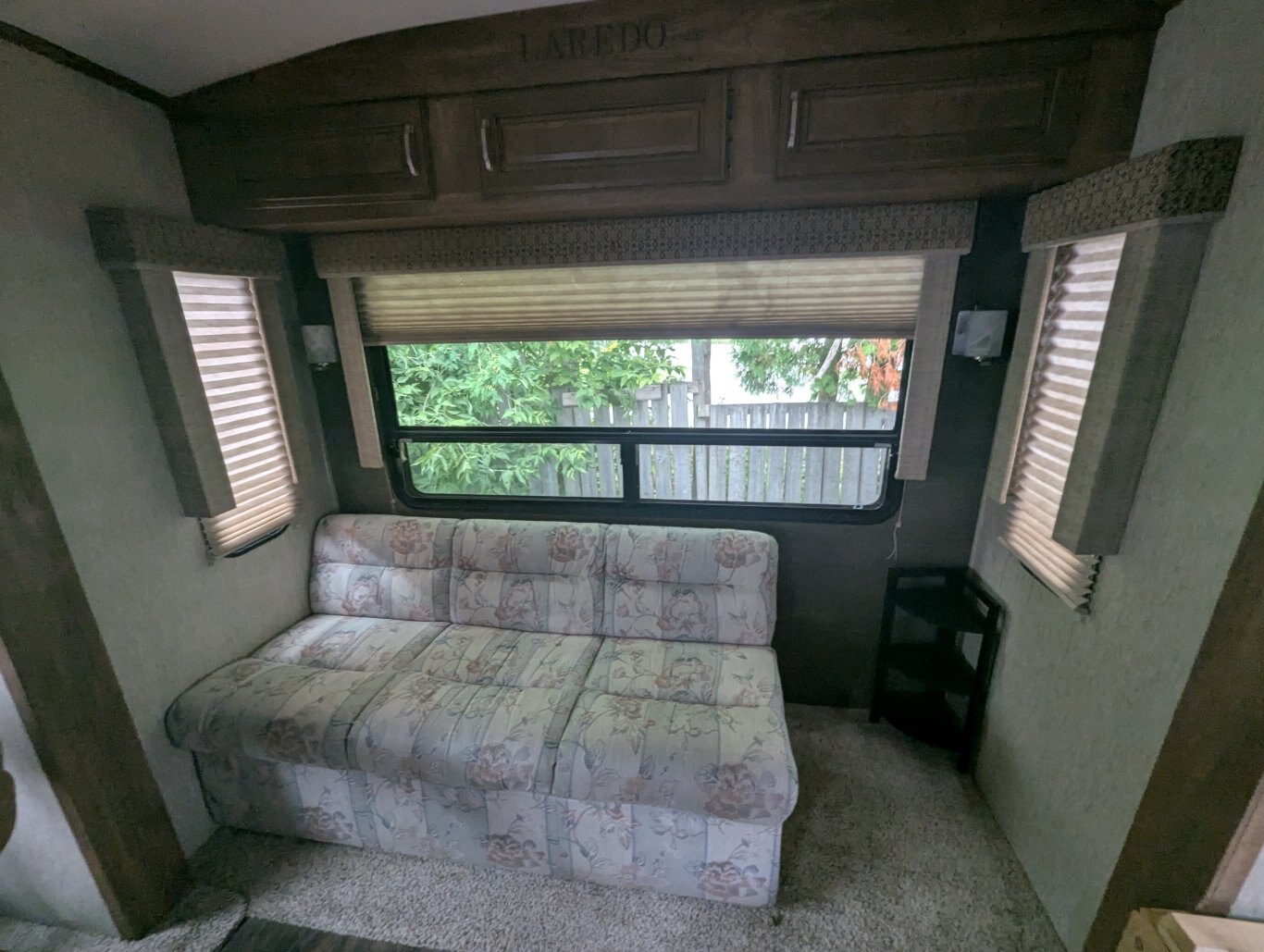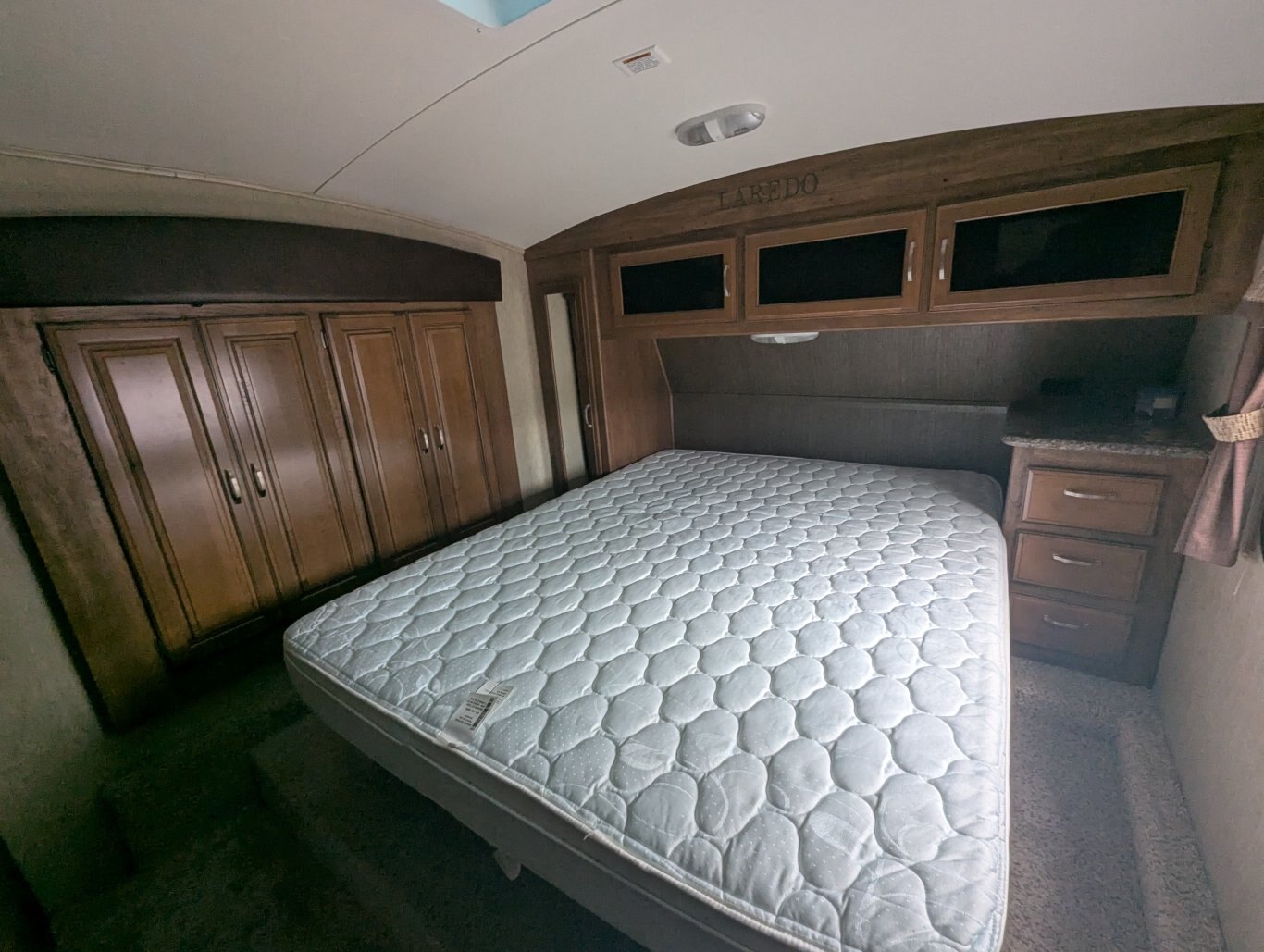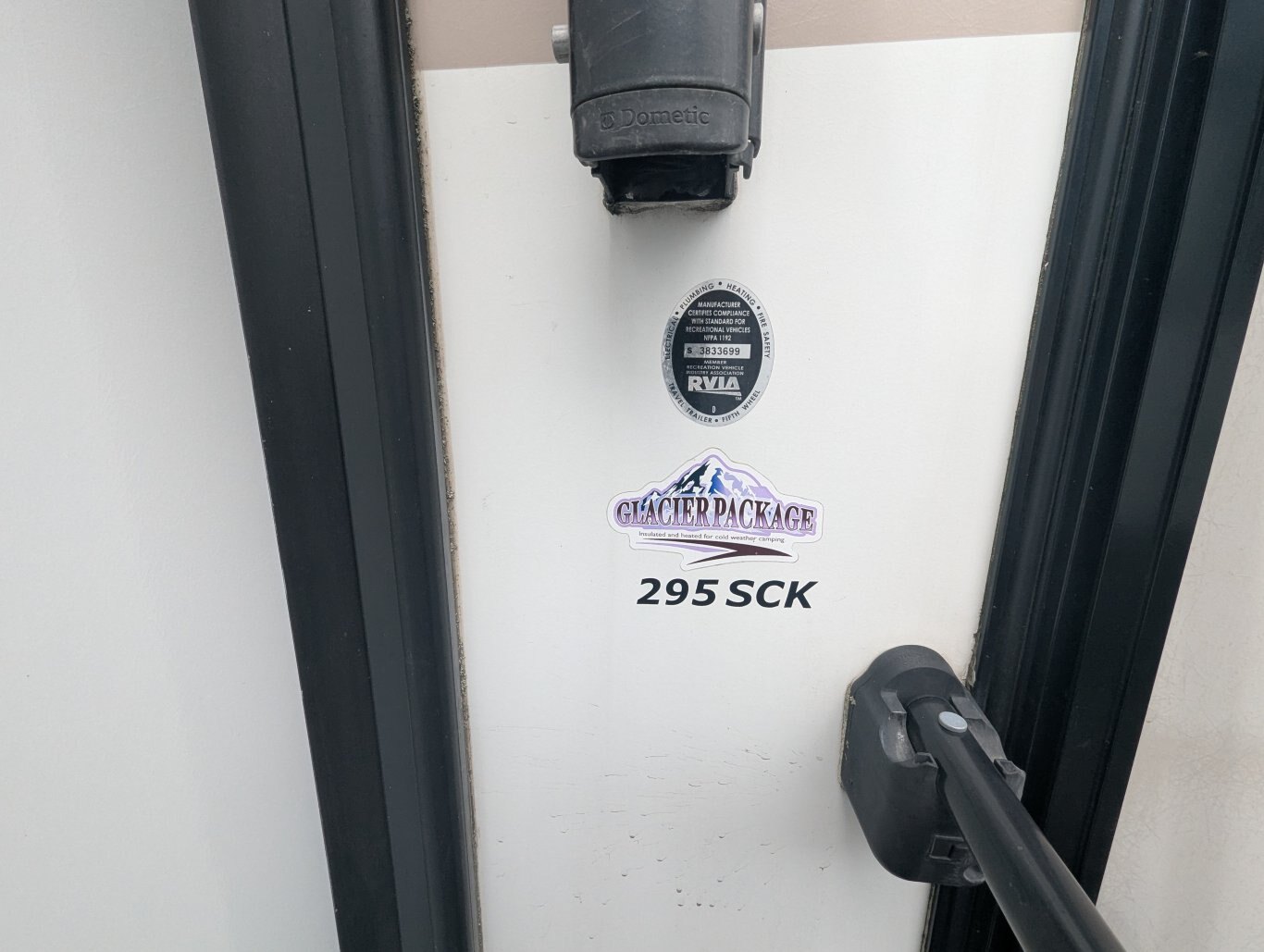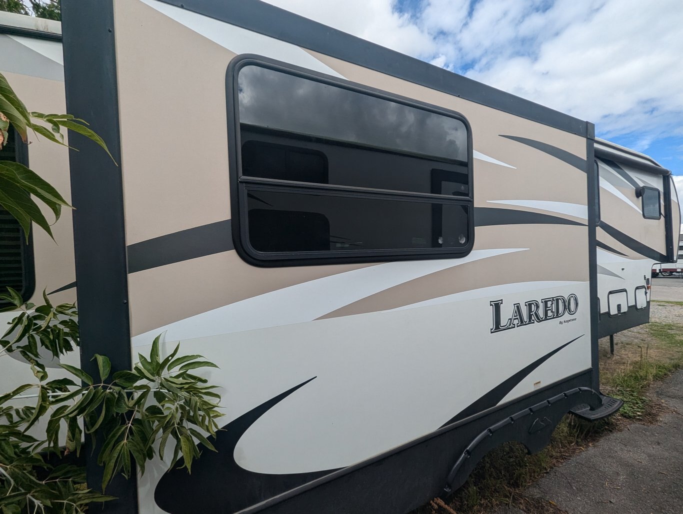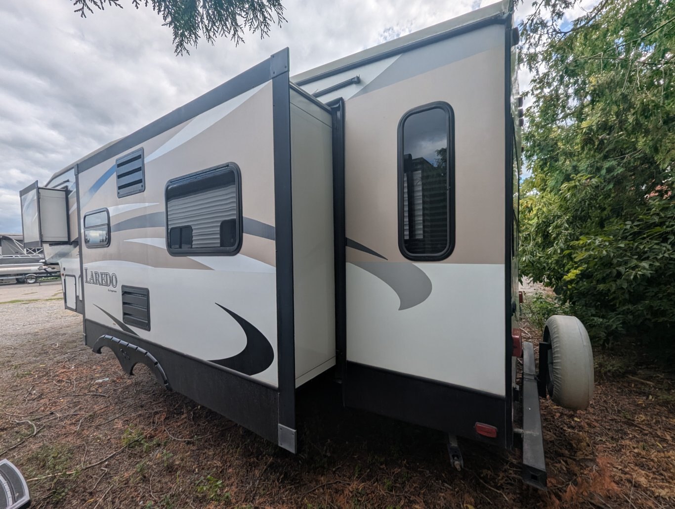 The 2015 Keystone Laredo 295SCK is a triple-slide Super Lite fifth wheel measuring approximately 32.5 feet with a dry weight around 7,900 lbs. It features a rear living layout with a spacious, open-concept living and kitchen area thanks to dual opposing slides, a private front bedroom with a queen bed, and a bathroom with a large shower. Key features include a vaulted ceiling, an entertainment center with a fireplace, leather furniture, ample kitchen storage, an enclosed underbelly for extended camping, a power awning, and preparation for a second air conditioner.