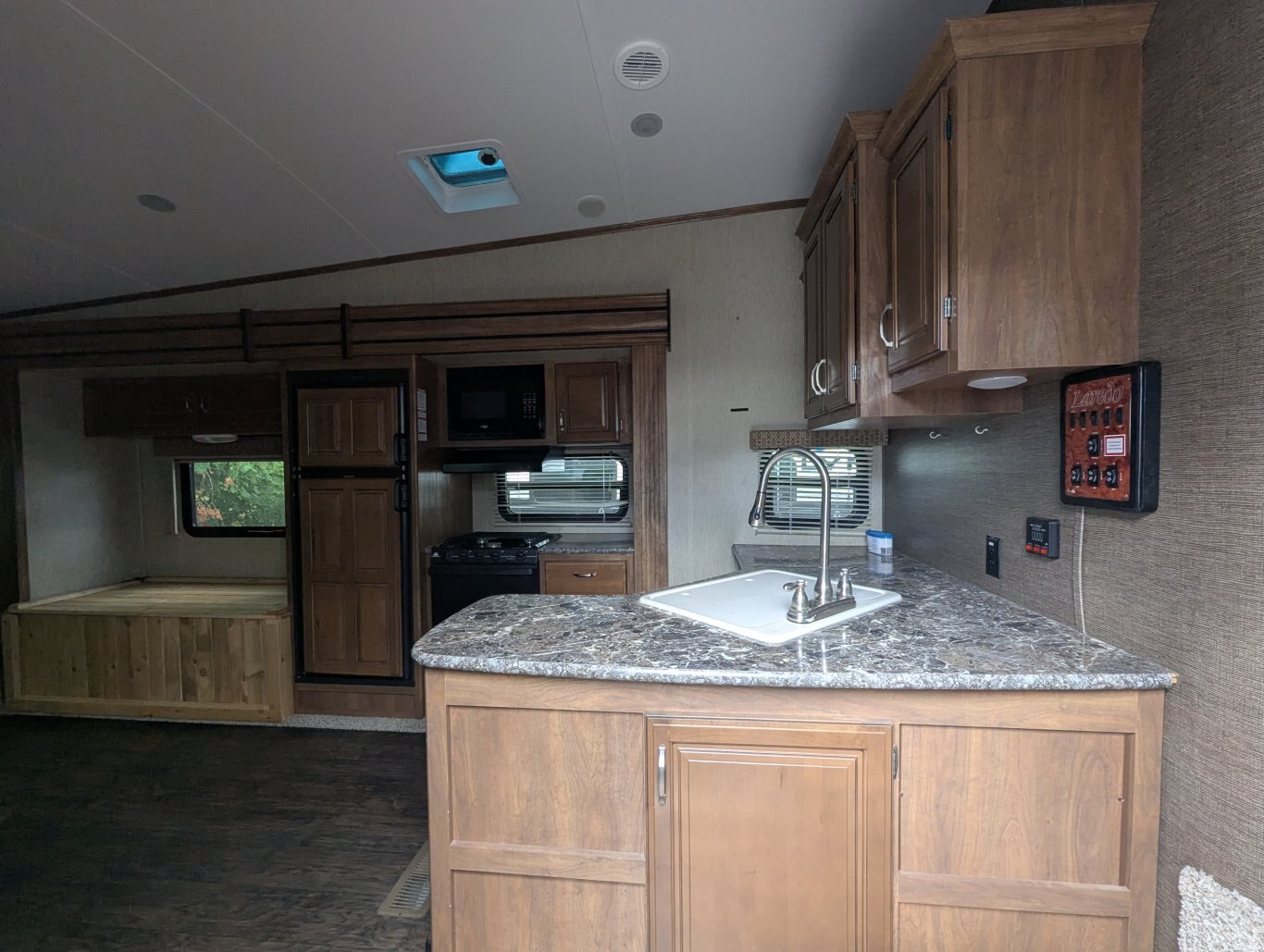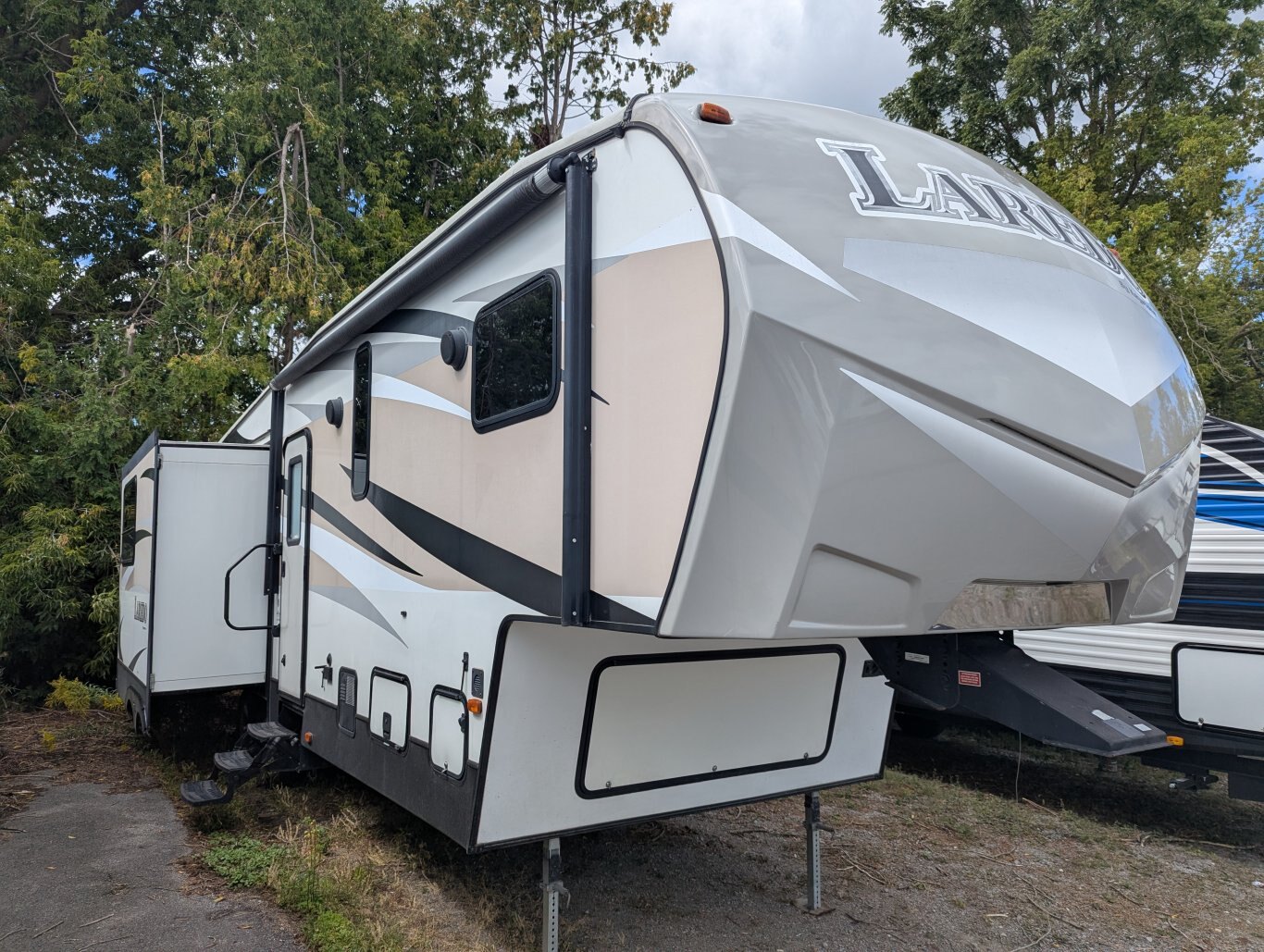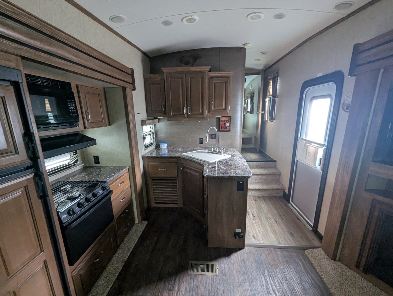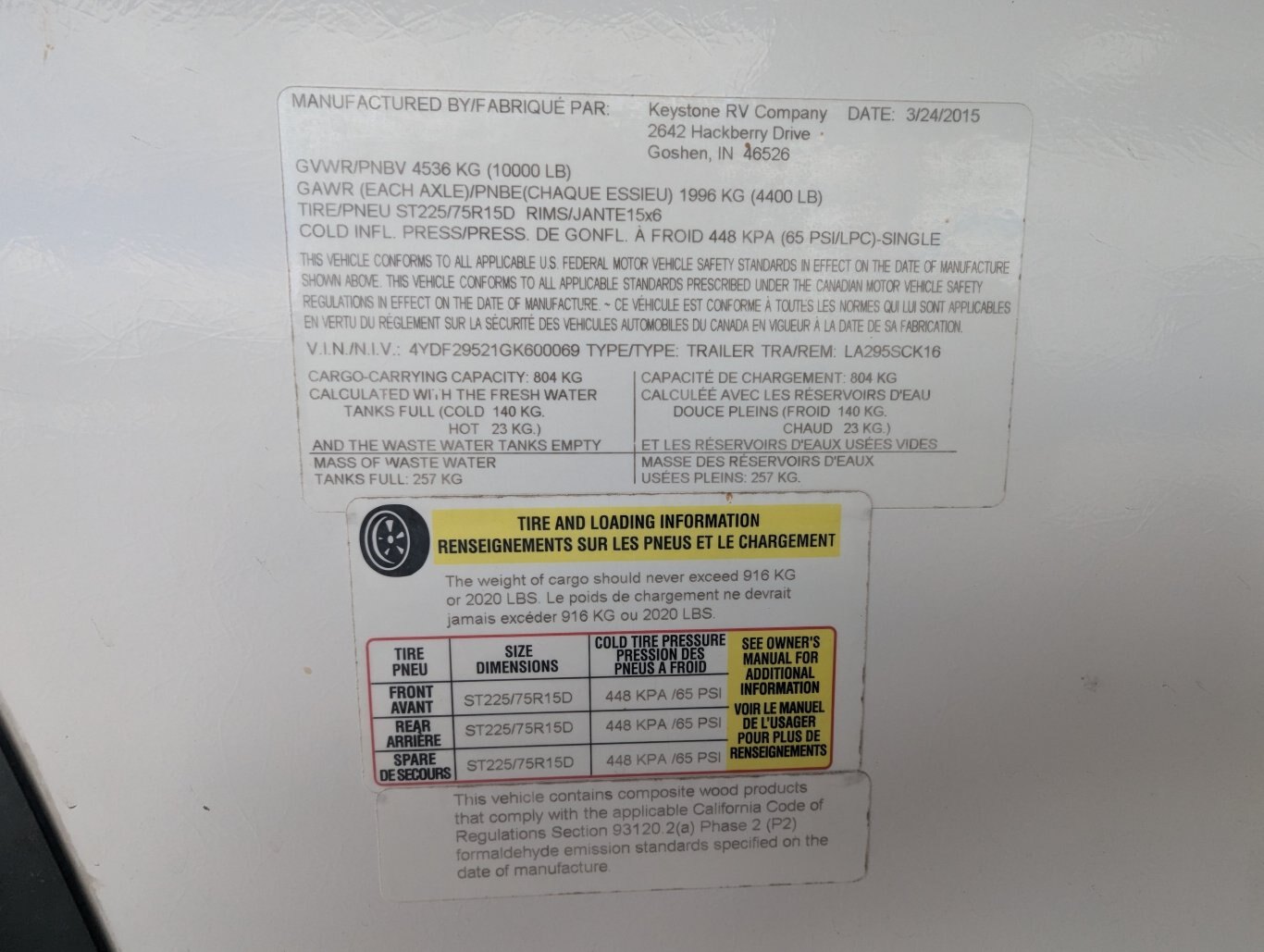 The 2015 Keystone Laredo 295SCK is a triple-slide Super Lite fifth wheel measuring approximately 32.5 feet with a dry weight around 7,900 lbs. It features a rear living layout with a spacious, open-concept living and kitchen area thanks to dual opposing slides, a private front bedroom with a queen bed, and a bathroom with a large shower. Key features include a vaulted ceiling, an entertainment center with a fireplace, leather furniture, ample kitchen storage, an enclosed underbelly for extended camping, a power awning, and preparation for a second air conditioner.