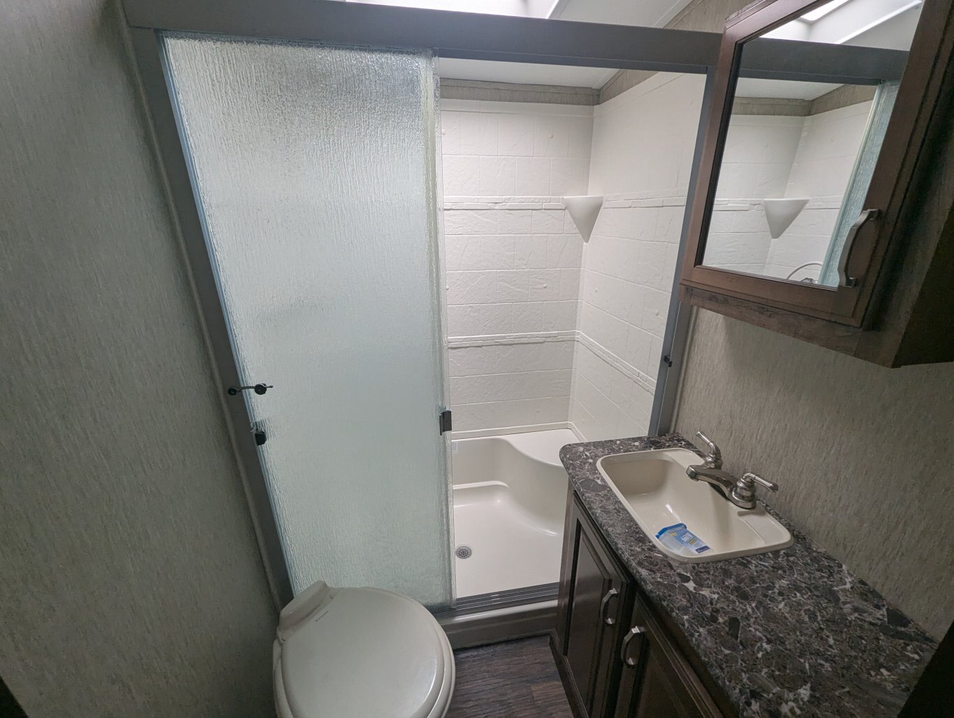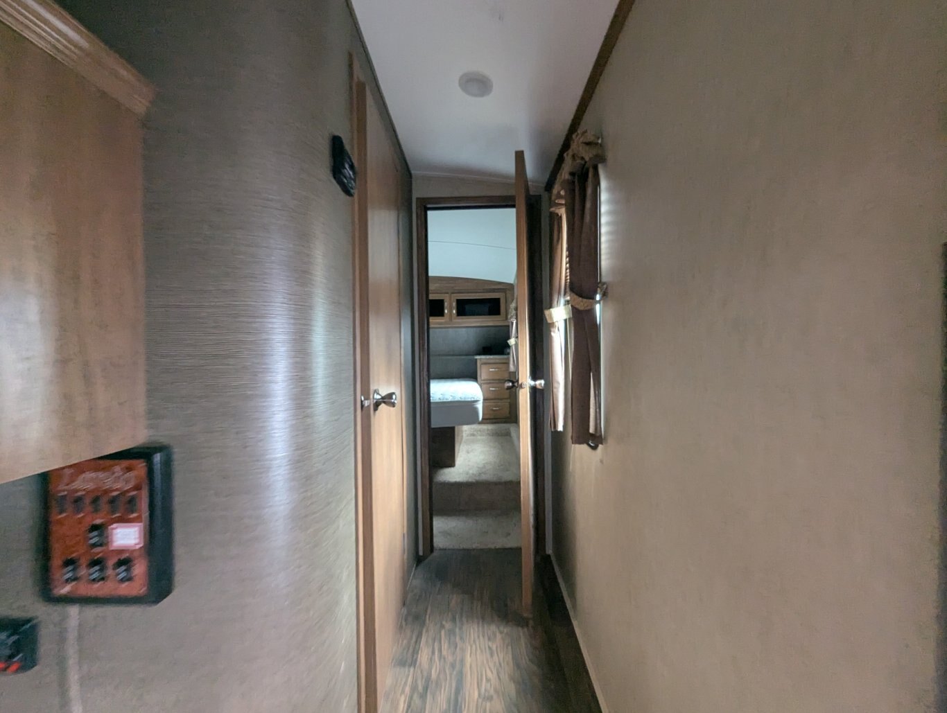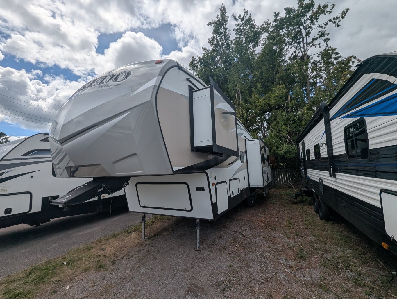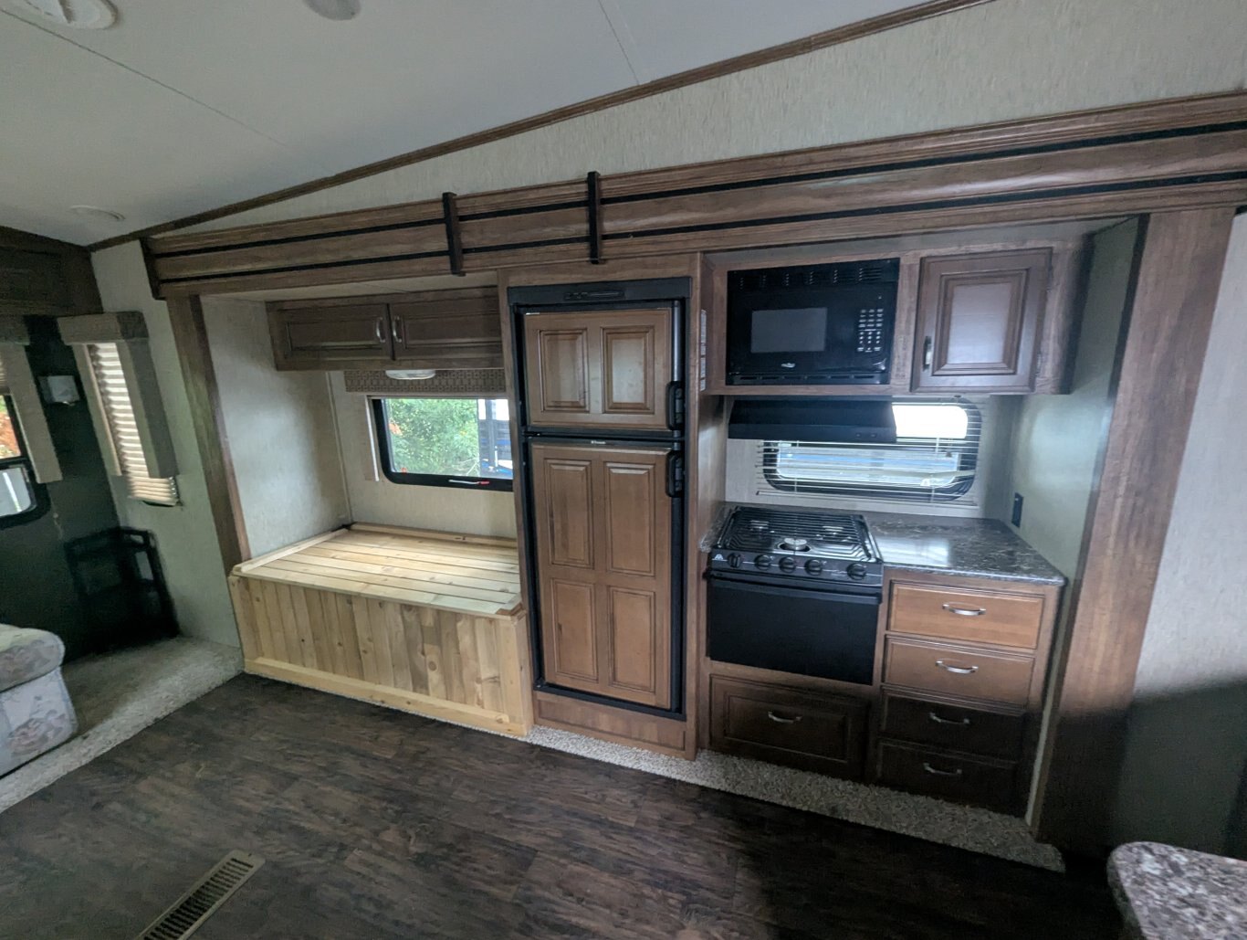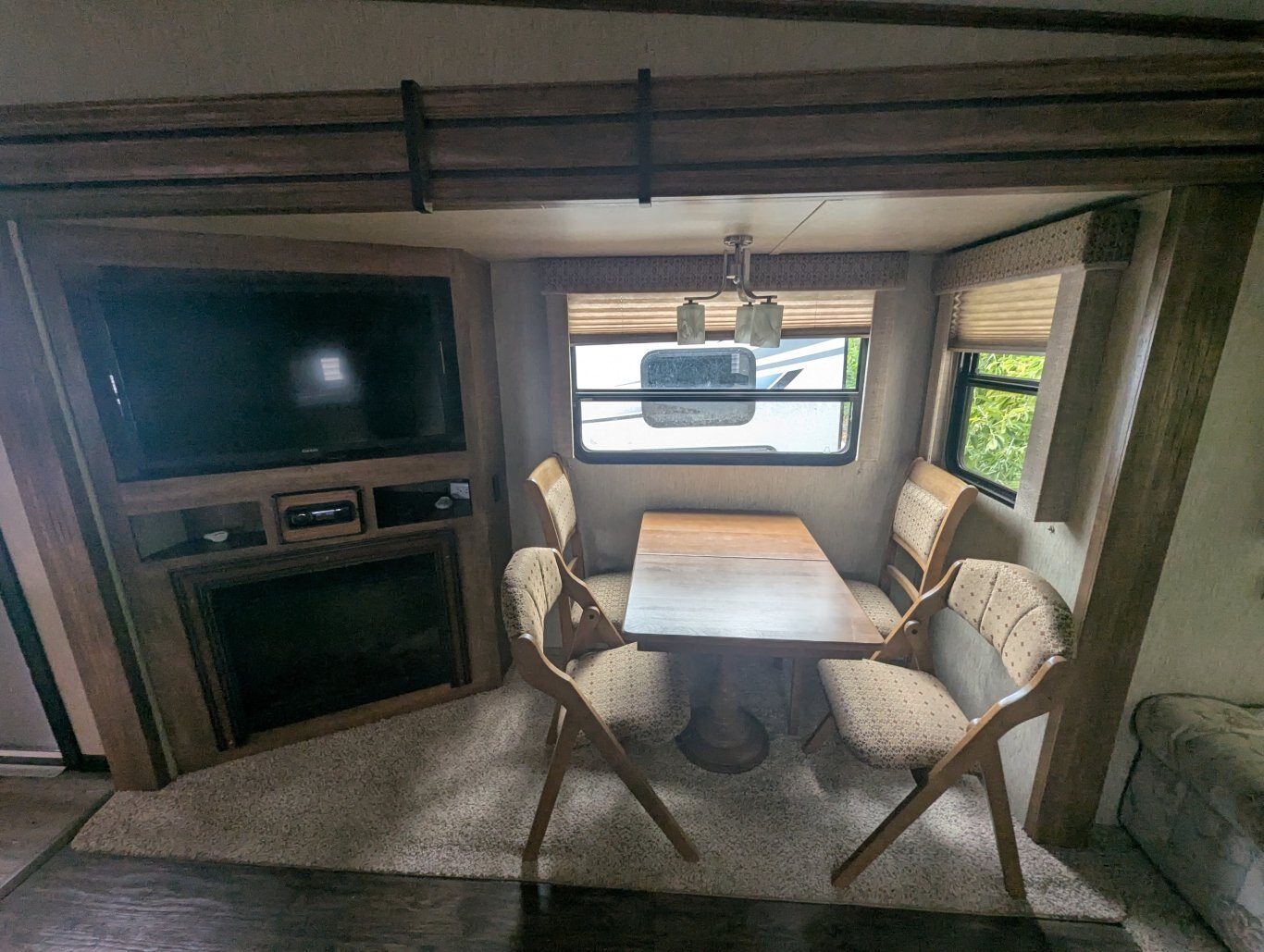The 2015 Keystone Laredo 295SCK is a triple-slide Super Lite fifth wheel measuring approximately 32.5 feet with a dry weight around 7,900 lbs. It features a rear living layout with a spacious, open-concept living and kitchen area thanks to dual opposing slides, a private front bedroom with a queen bed, and a bathroom with a large shower. Key features include a vaulted ceiling, an entertainment center with a fireplace, leather furniture, ample kitchen storage, an enclosed underbelly for extended camping, a power awning, and preparation for a second air conditioner.