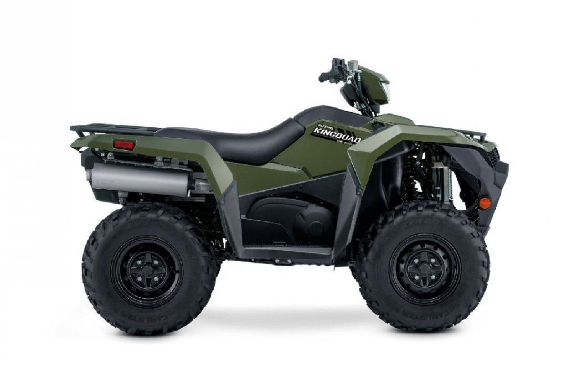 BETTER CONTROL AND COMFORT Independent double A-arm front suspension (6.7 inches of wheel travel) includes large diameter, gas-charged shock absorbers with five-way spring preload adjustment. Fully independent, A-arm/I-beam rear suspension with 7.7 inches of wheel travel includes large diameter, gas-charged shock absorbers with five-way spring preload adjustment. A large diameter rear stabilizer bar with compliant bushings helps control body movement while reducing shocks to the rider. The dual hydraulic front disc brakes combine high-friction brake pad material, fluid lines, and a lever ratio to provide optimal braking performance. The sealed, multi-plate rear brake system's foot brake lever ratio provides great rider control. The rear brake's clutch-type design means high durability, reduced unsprung weight, and low maintenance. High traction 25-inch Carlisle tires are mounted on strong steel wheels with a durable, powder-coated matte-black finish. Suzuki's plush T-shaped seat delivers rider mobility during spirited or difficult terrain riding. Polyethylene skid plates provide protection with minimal resistance over rocks and rough terrain. Durable plastic guards protect the front and rear half shafts.