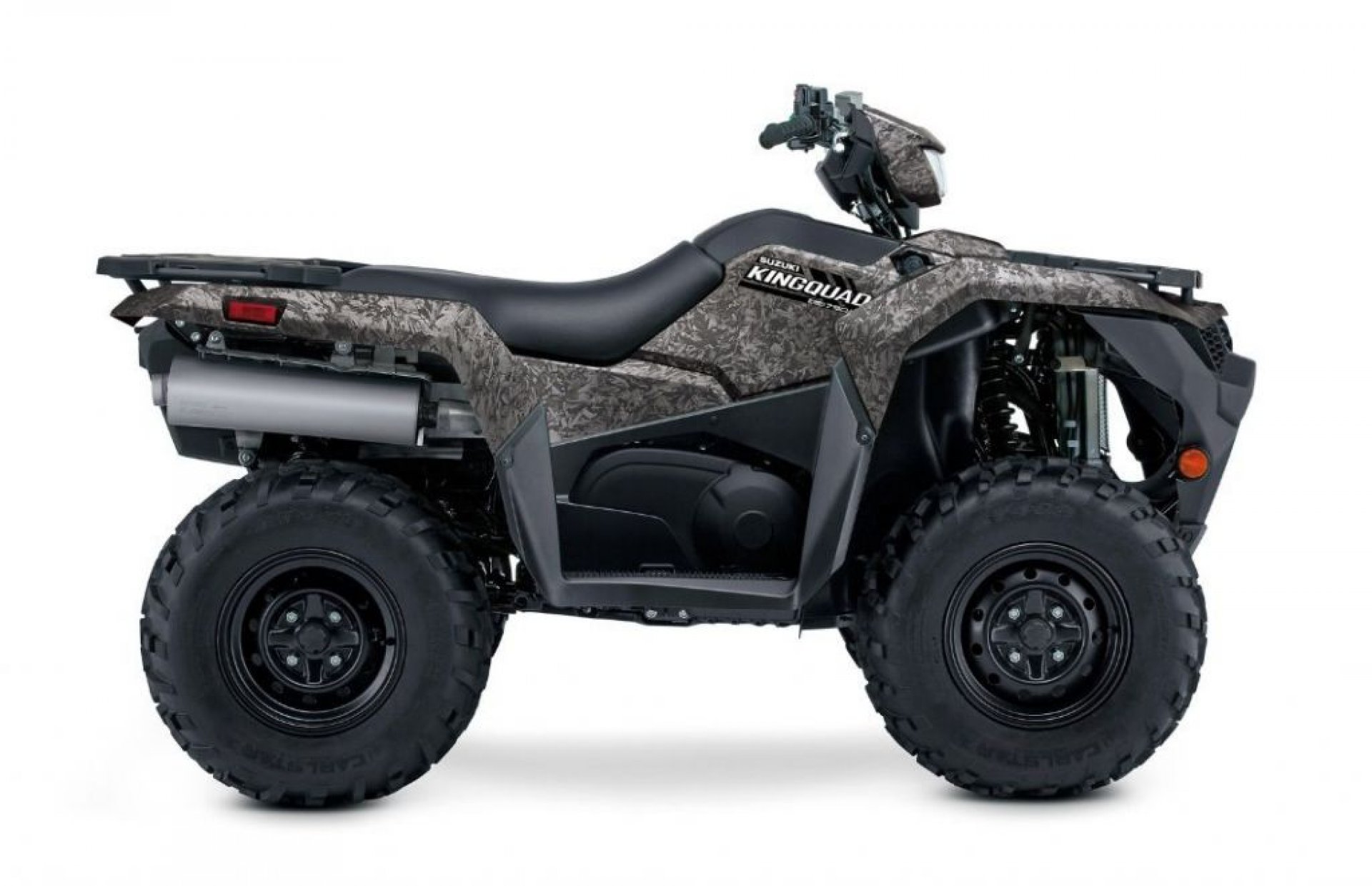 BETTER CONTROL AND COMFORT Independent double A-arm front suspension (6.7 inches of wheel travel) includes large diameter, gas-charged shock absorbers with five-way spring preload adjustment. Fully independent, A-arm/I-beam rear suspension with 7.7 inches of wheel travel includes large diameter, gas-charged shock absorbers with five-way spring preload adjustment. A large diameter rear stabilizer bar with compliant bushings helps control body movement while reducing shocks to the rider. The dual hydraulic front disc brakes combine high-friction brake pad material, fluid lines, and a lever ratio to provide optimal braking performance. The sealed, multi-plate rear brake system's foot brake lever ratio provides great rider control. The rear brake's clutch-type design means high durability, reduced unsprung weight, and low maintenance. High traction 25-inch Carlisle tires are mounted on strong steel wheels with a durable, powder-coated matte-black finish. Suzuki's plush T-shaped seat delivers rider mobility during spirited or difficult terrain riding. Polyethylene skid plates provide protection with minimal resistance over rocks and rough terrain. Durable plastic guards protect the front and rear half shafts.