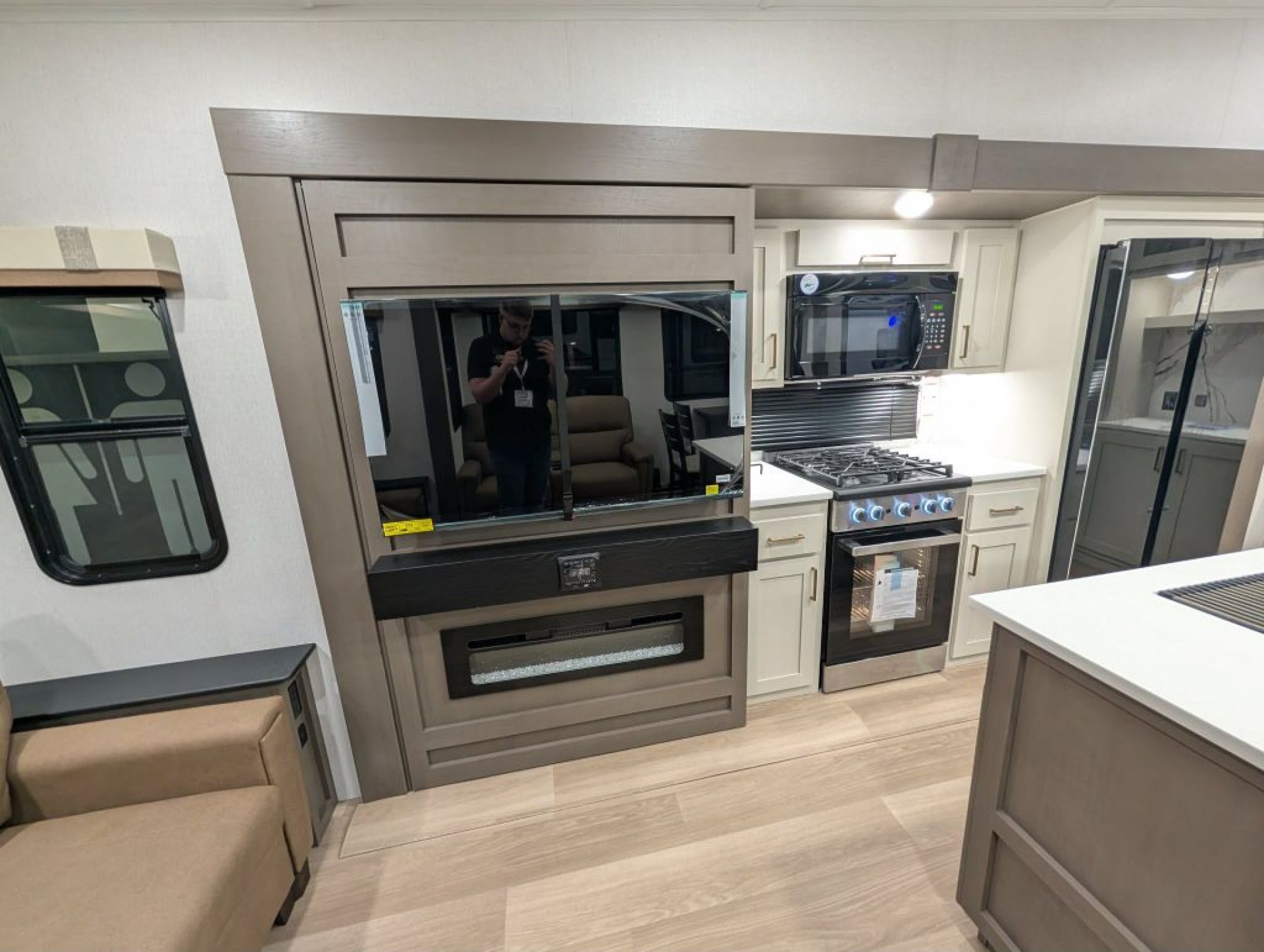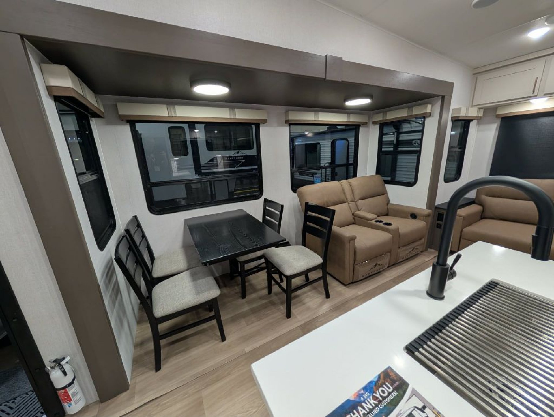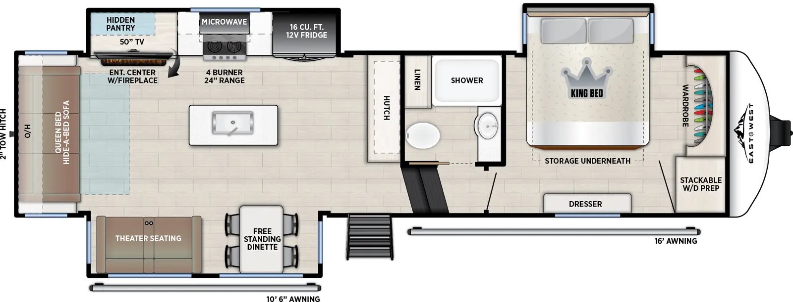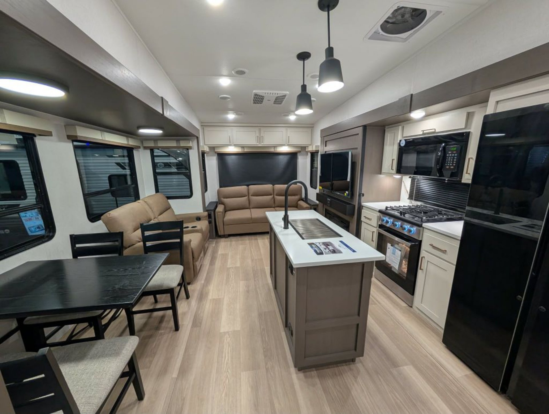 The 2026 Tandara 295RL fifth wheel by East to West RV delivers a beautifully updated design and a feature-packed floorplan perfect for couples seeking comfort and extended stays. Measuring approximately 35 feet long with a dry weight around 11 400 pounds this three-slide rear living model showcases the brand’s refreshed 2026 interior décor with modern two-tone cabinetry updated flooring and stylish furnishings. The spacious rear living area features a sleeper sofa theater seating with cupholders an entertainment center with smart TV and fireplace and a hidden pantry for added storage. The kitchen is equally impressive with solid surface countertops a large island with undermount sink four-burner range and oven high-point microwave and a spacious 12-volt refrigerator. A freestanding dinette with four chairs sits beside large panoramic windows creating a bright and inviting dining space.