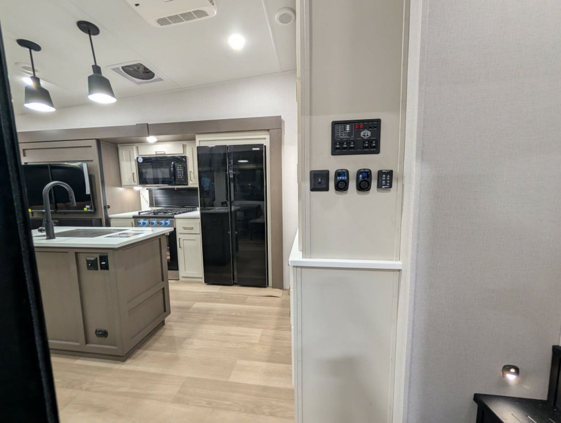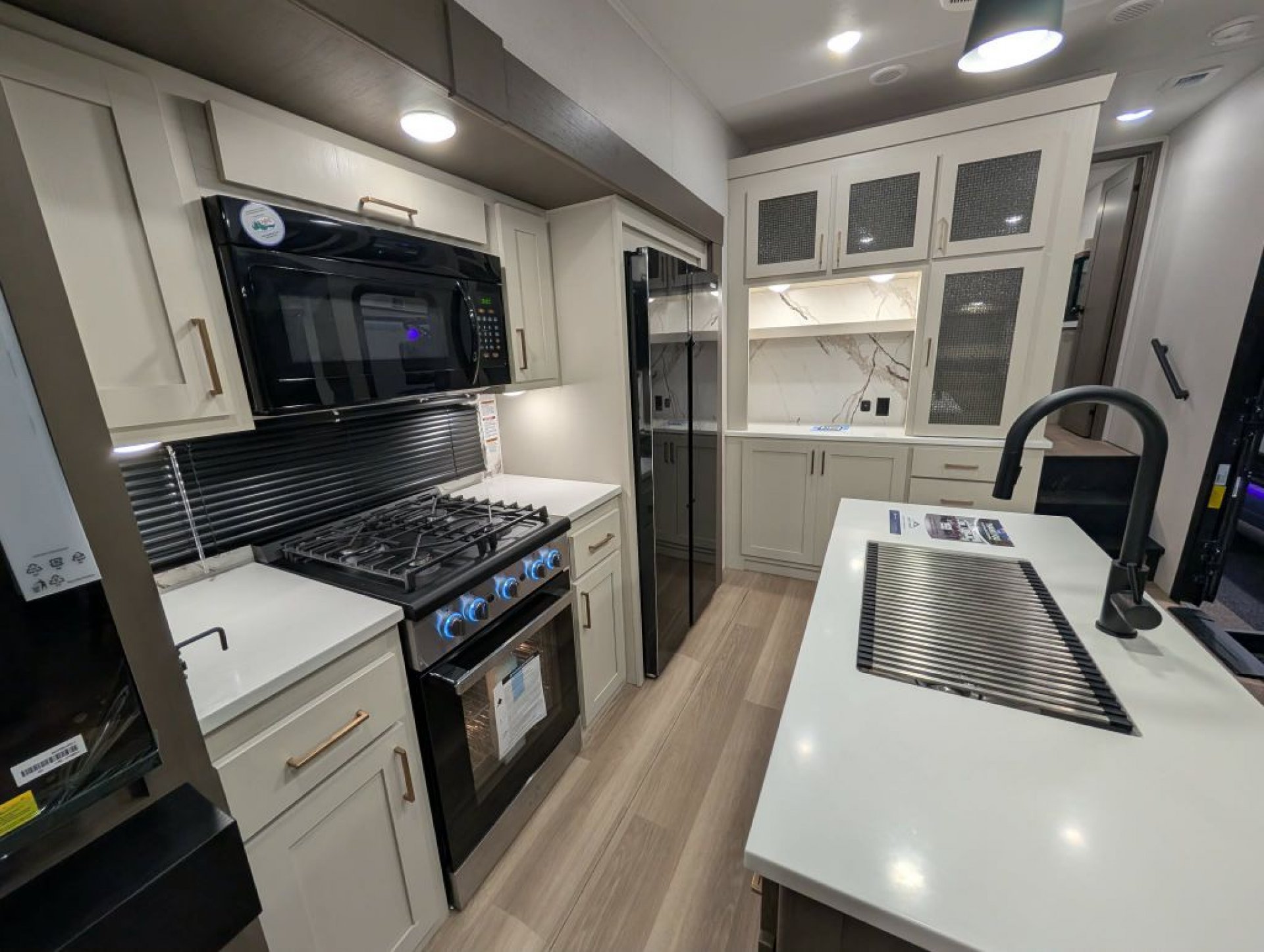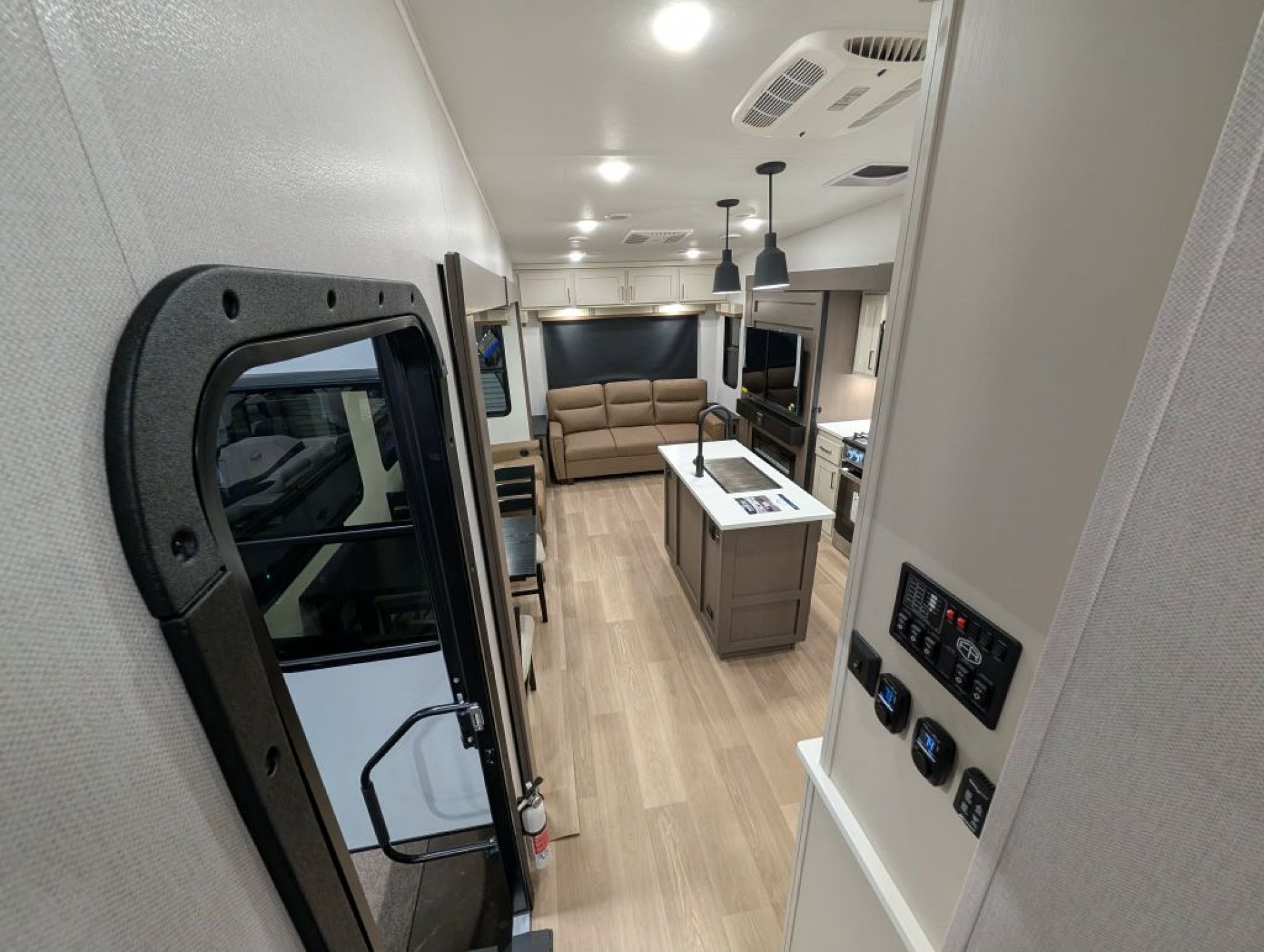 The 2026 Tandara 295RL fifth wheel by East to West RV delivers a beautifully updated design and a feature-packed floorplan perfect for couples seeking comfort and extended stays. Measuring approximately 35 feet long with a dry weight around 11 400 pounds this three-slide rear living model showcases the brand’s refreshed 2026 interior décor with modern two-tone cabinetry updated flooring and stylish furnishings. The spacious rear living area features a sleeper sofa theater seating with cupholders an entertainment center with smart TV and fireplace and a hidden pantry for added storage. The kitchen is equally impressive with solid surface countertops a large island with undermount sink four-burner range and oven high-point microwave and a spacious 12-volt refrigerator. A freestanding dinette with four chairs sits beside large panoramic windows creating a bright and inviting dining space.