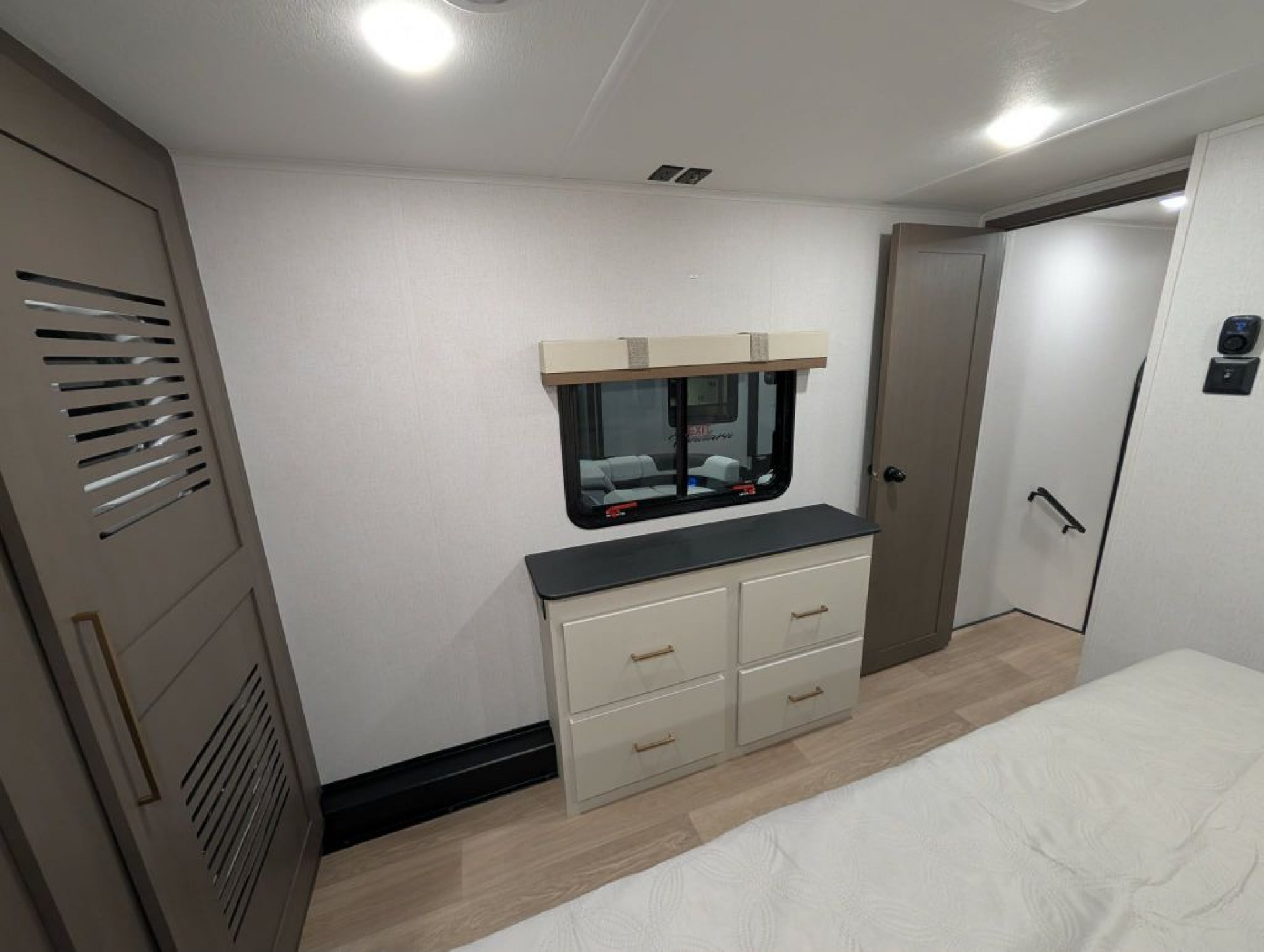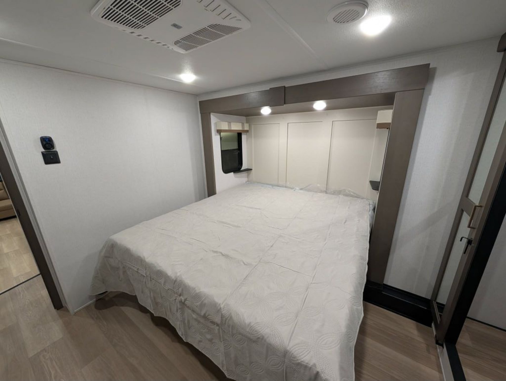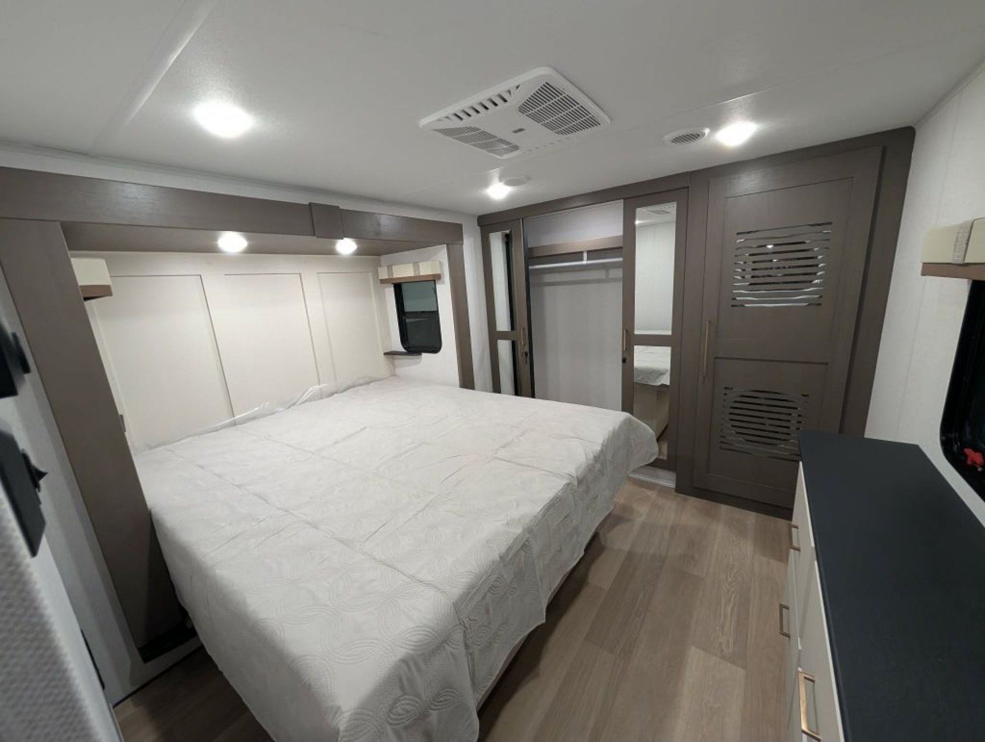 Upstairs the bathroom offers a porcelain foot-flush toilet glass-enclosed shower with skylight generous linen storage and on-demand hot water. The front bedroom includes a king bed with under-bed storage washer/dryer prep (with this unit equipped for stackables) ample closet space dresser storage and prep for a bedroom TV. Comfort is enhanced with ducted A/C units—an impressive feature for a coach this size—along with efficient heating and enclosed underbelly construction.