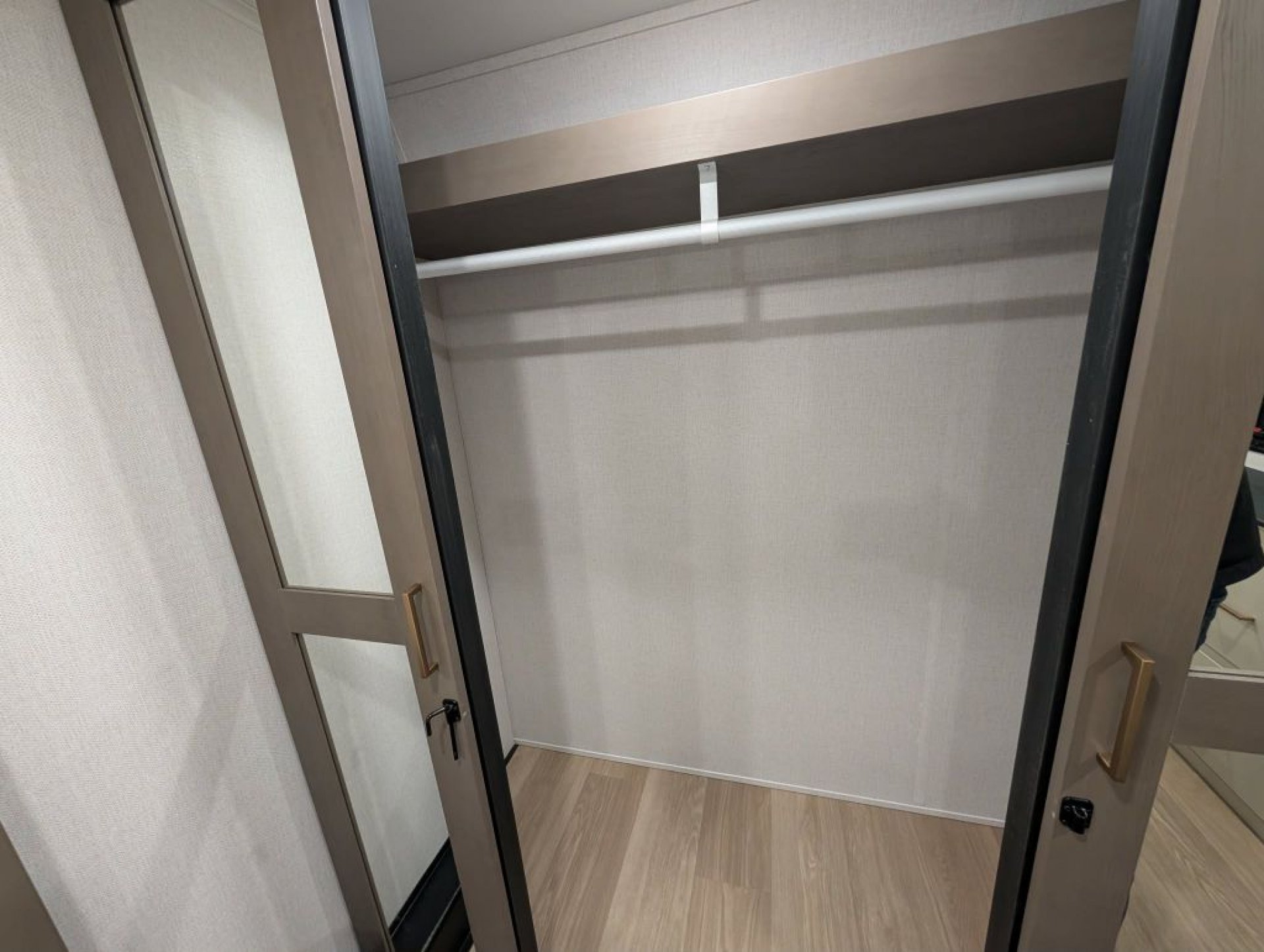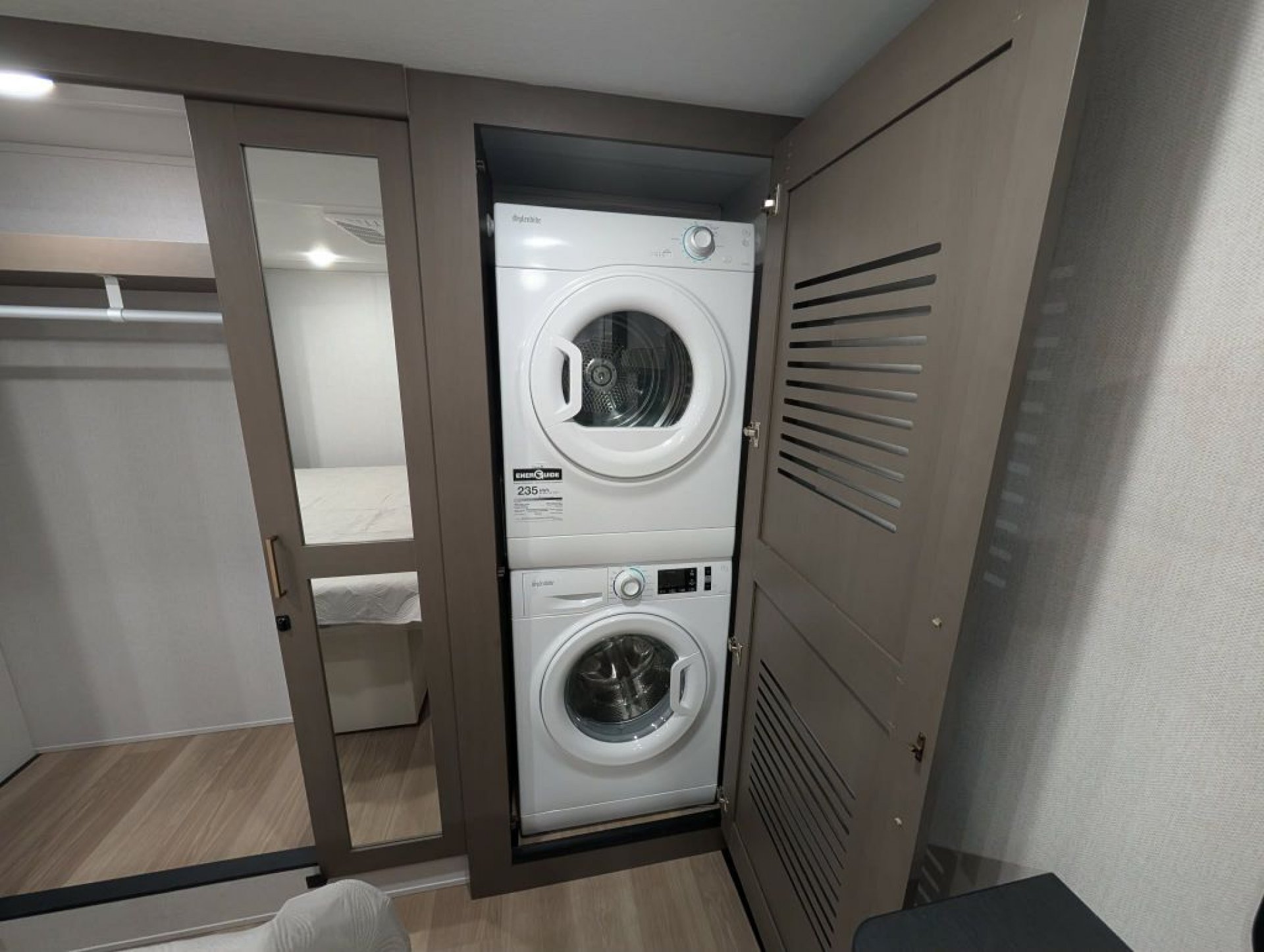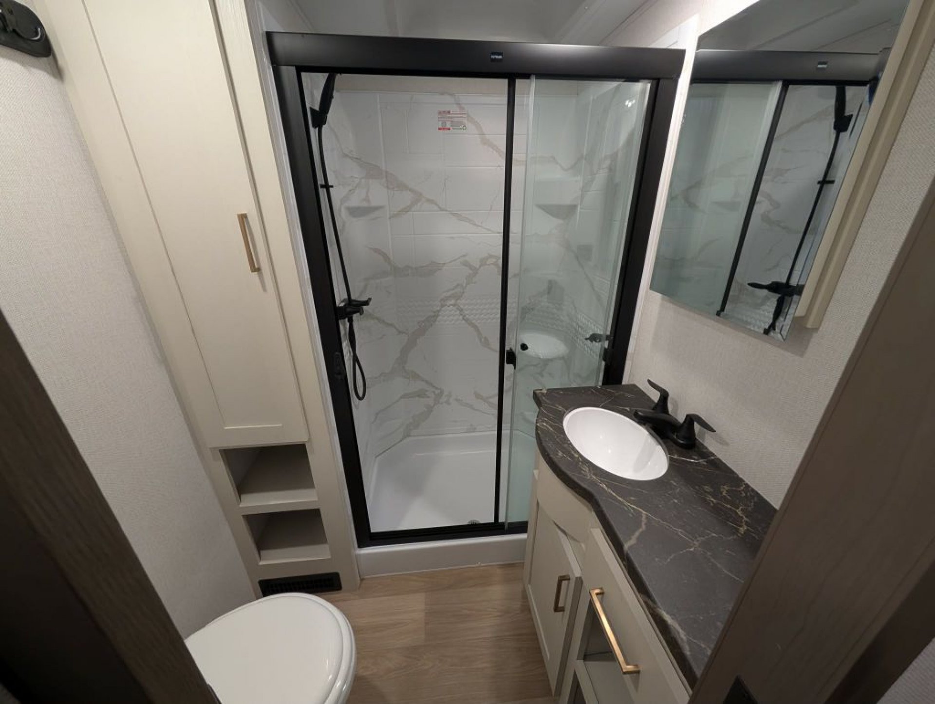 Upstairs the bathroom offers a porcelain foot-flush toilet glass-enclosed shower with skylight generous linen storage and on-demand hot water. The front bedroom includes a king bed with under-bed storage washer/dryer prep (with this unit equipped for stackables) ample closet space dresser storage and prep for a bedroom TV. Comfort is enhanced with ducted A/C units—an impressive feature for a coach this size—along with efficient heating and enclosed underbelly construction.