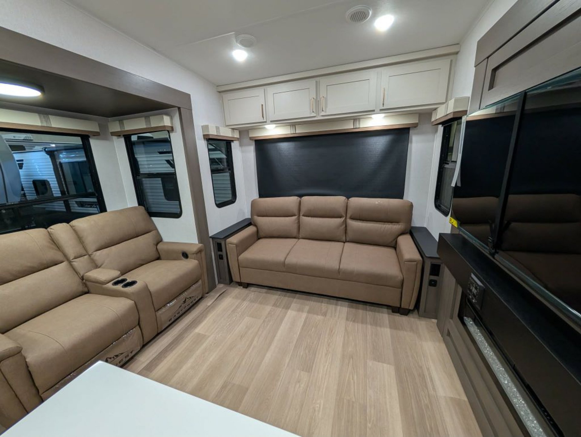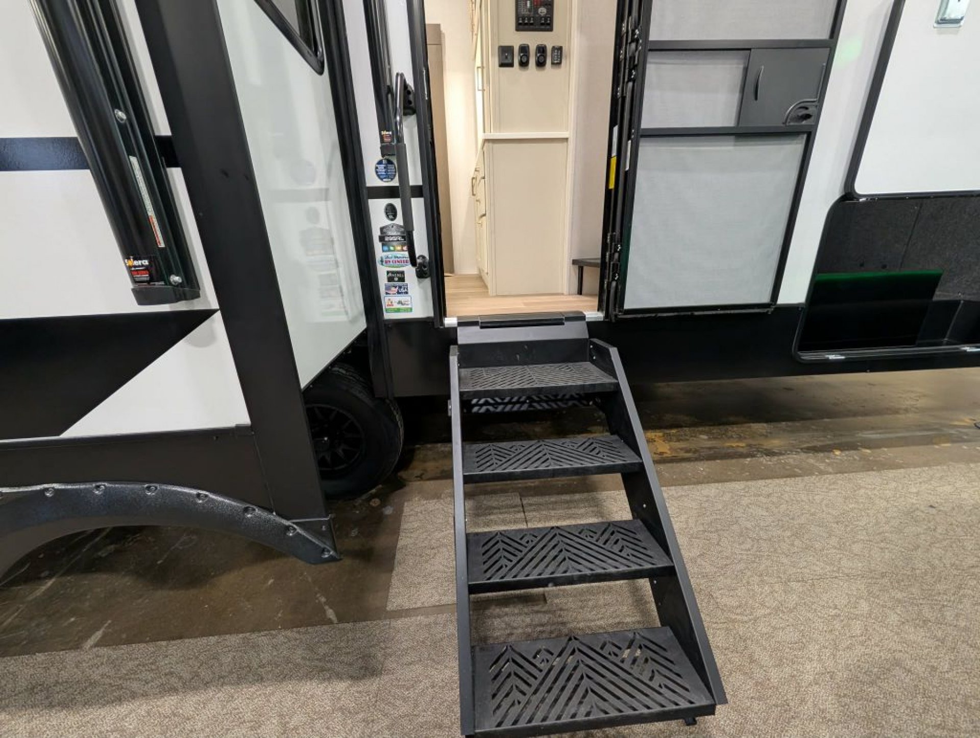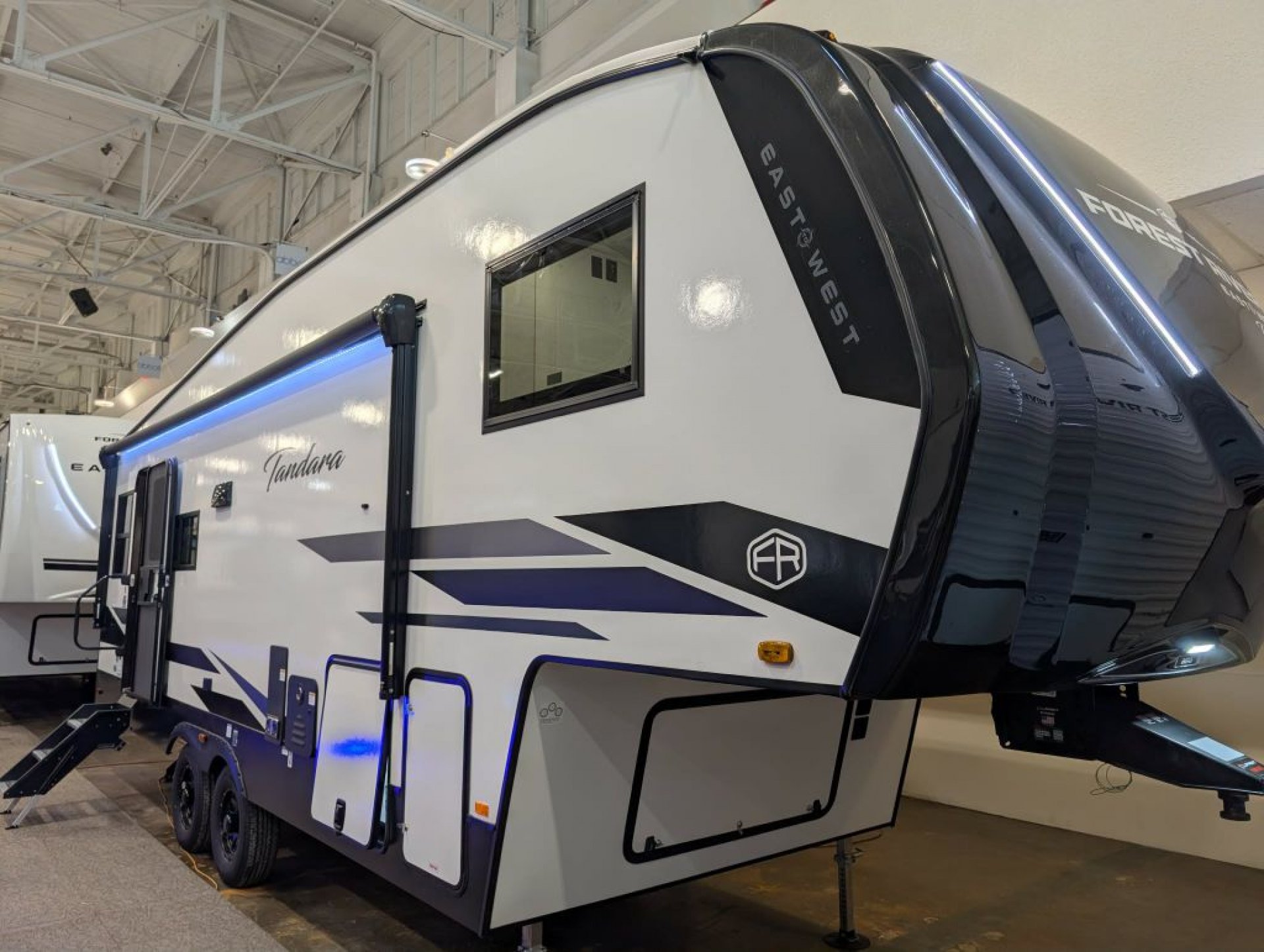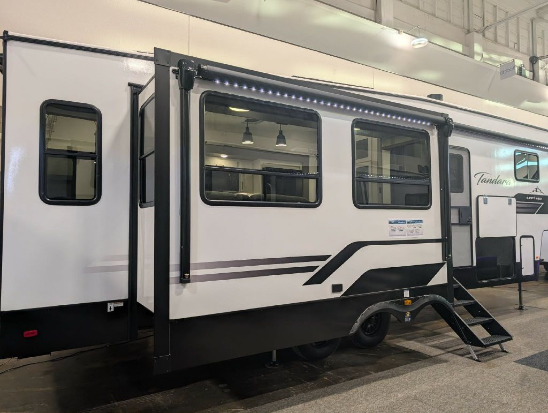 Built with laminated sidewalls featuring Azdel composite backing aluminum framing and a high-profile front cap for 2026 the Tandara 295RL is engineered for durability and reduced risk of delamination. Exterior highlights include dual power awnings with LED lighting a four-point electric auto-level system large pass-through storage 50-amp service 200-watt panel backup camera prep and a 3 000-pound rated rear hitch receiver.
