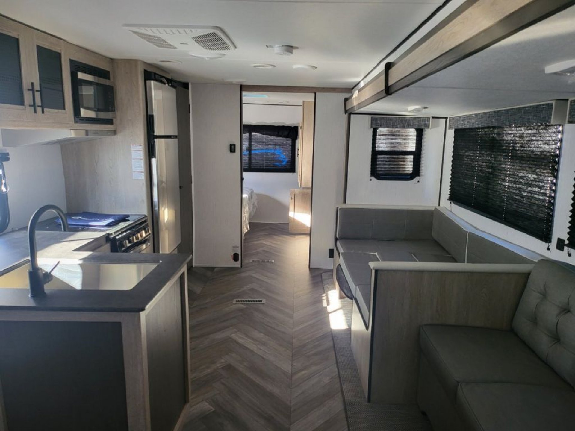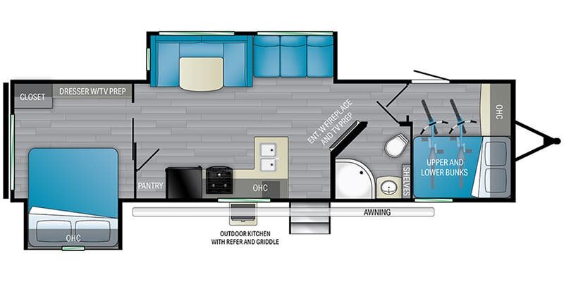 With a private front bedroom, rear bunkroom, and central U-shaped dinette, the Prowler 323BR sleeps the whole family while giving everyone their own space. Enjoy meals inside or cook outdoors with the pass-through storage and exterior kitchen options. Keystone-quality construction ensures reliable towing, durability, and a smooth camping experience.