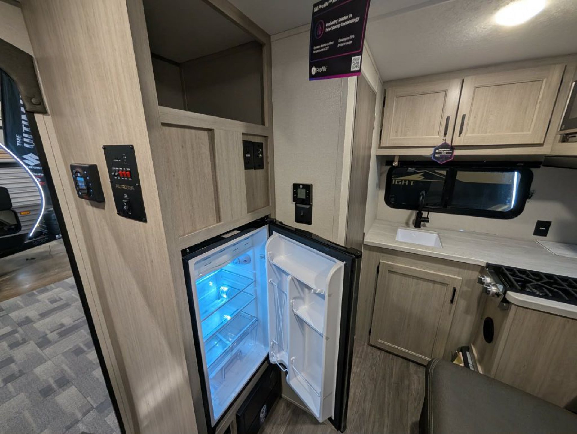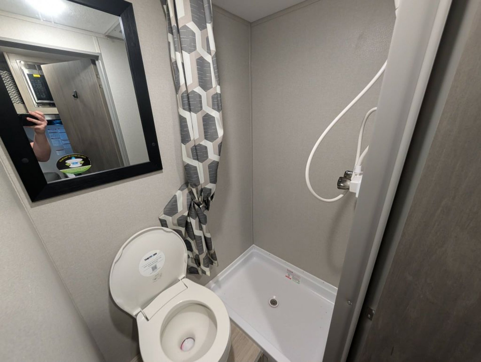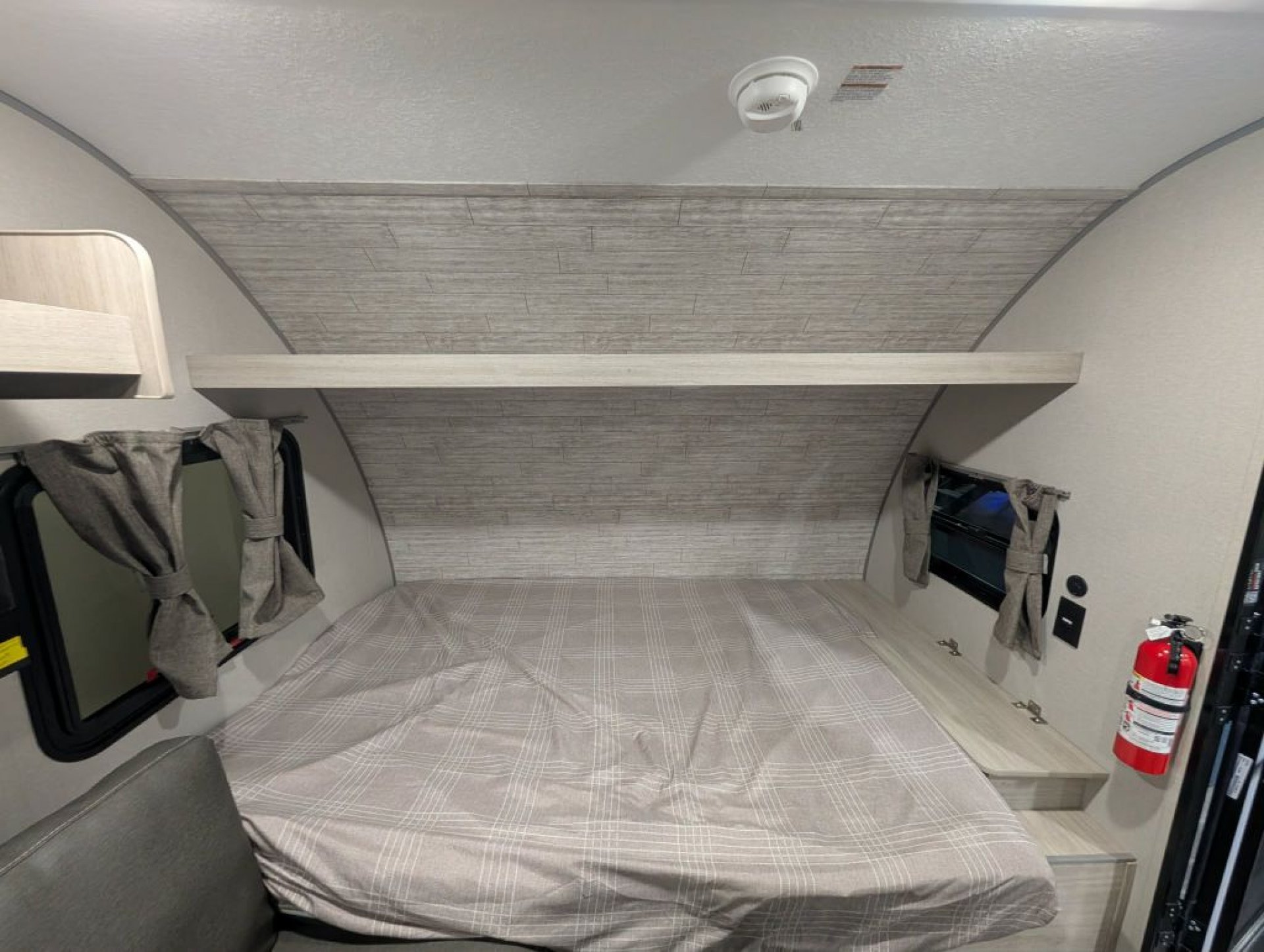 - Interior Features: All-In-One Control Panel; Full GE Kitchen Suite; JBL Entertainment Package; Paper Towel Holder; GE Stainless Microwave; 12V Power Vent Fan Above Shower; Carpetless Unit with Lino in Slide-Out; Easy Access Kickboard Storage Underneath Jiffy Sofa; Matte Black Kitchen and Bathroom Faucets; 12V USB in Kitchen; ABS Tub/Shower Surround; LED Interior Lighting; Bedroom USB Surface Mounts (2); USB Surface Mount Near Bunk Beds; Jiffy Sofa with Flip-Down Cup Holder/Arm Rest; Pedestal Thermofoil Dinette Table (Floorplan Dependent); Hard Valance Window Treatment with Decorative Lambrequins; Black Nightshades in Living Room; Shower/Coat Hooks; Bathroom Mirror; Mirrored Wardrobes in Master Bedroom; Underbed Storage with Separation from Outside Front Storage