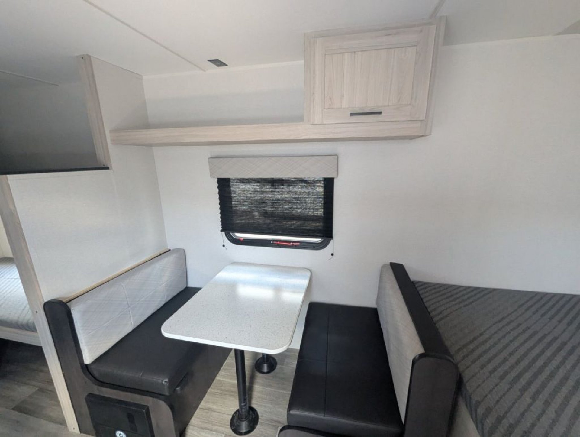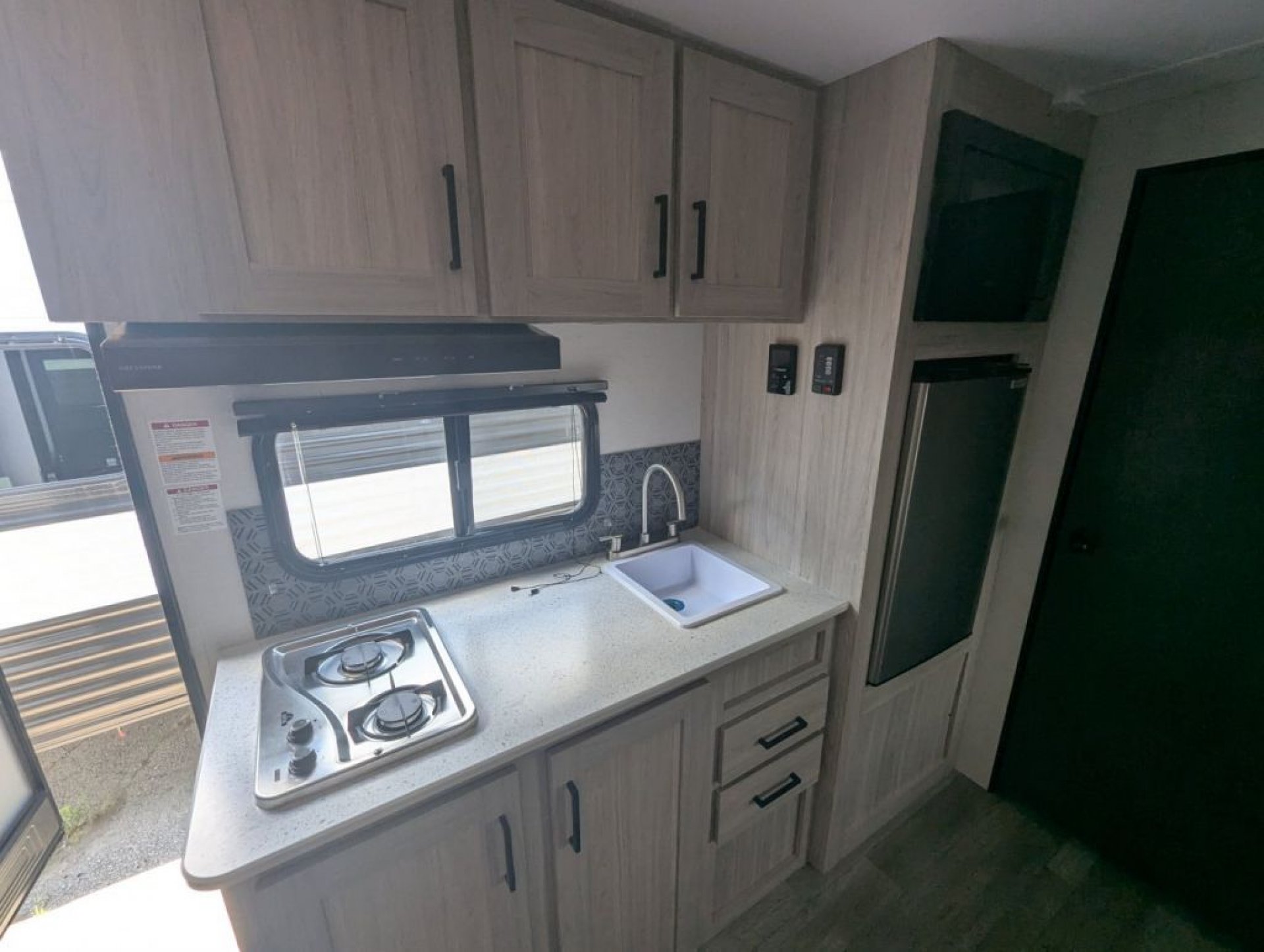 - Converter: 2 burner cooktop, microwave, electric fireplace