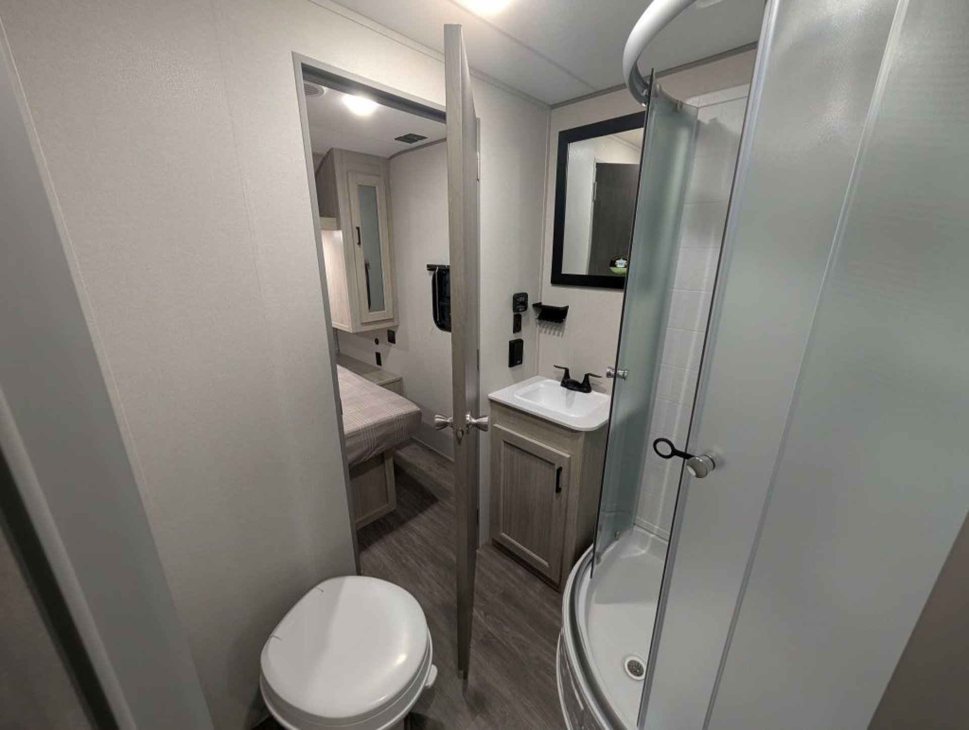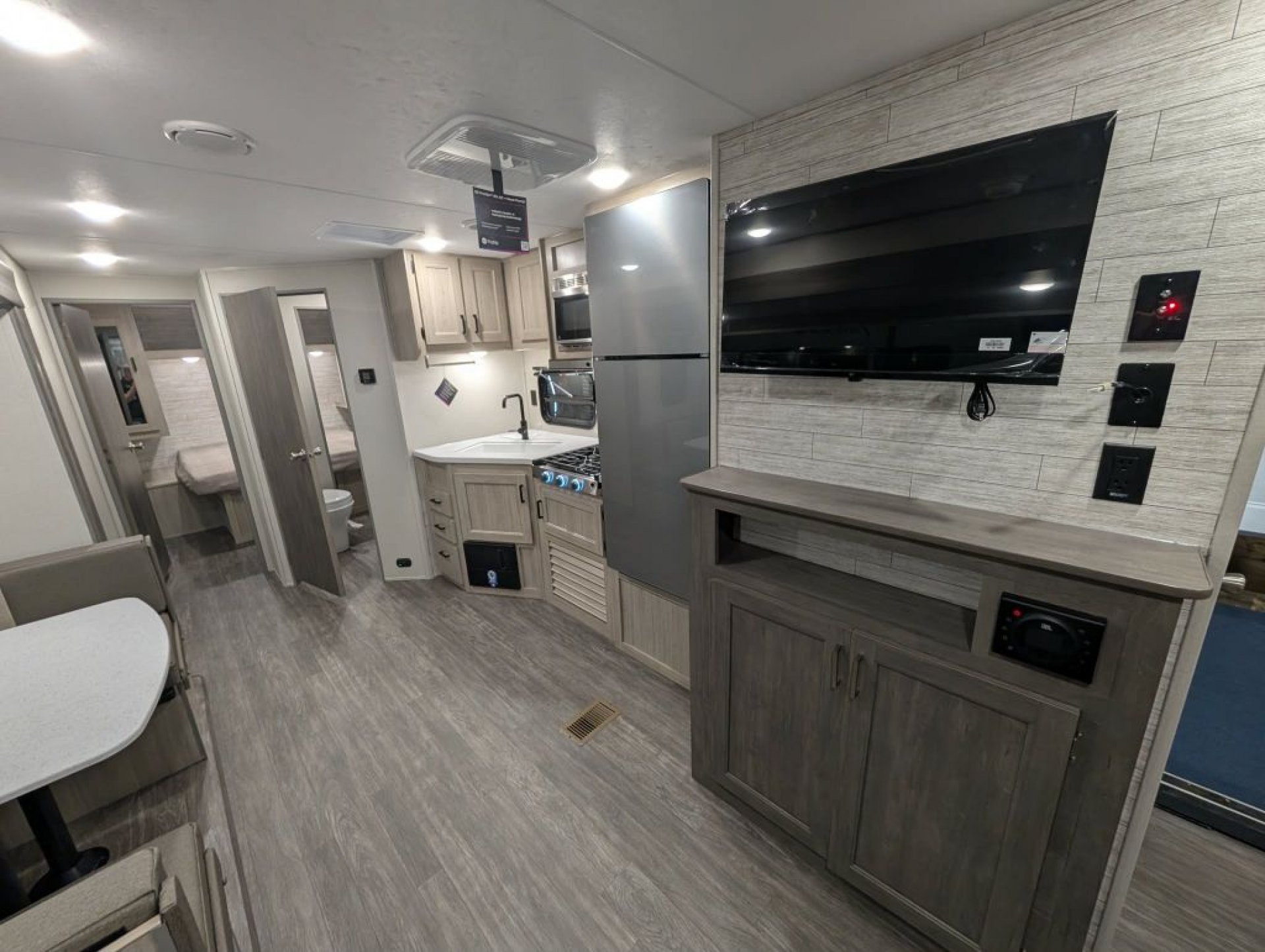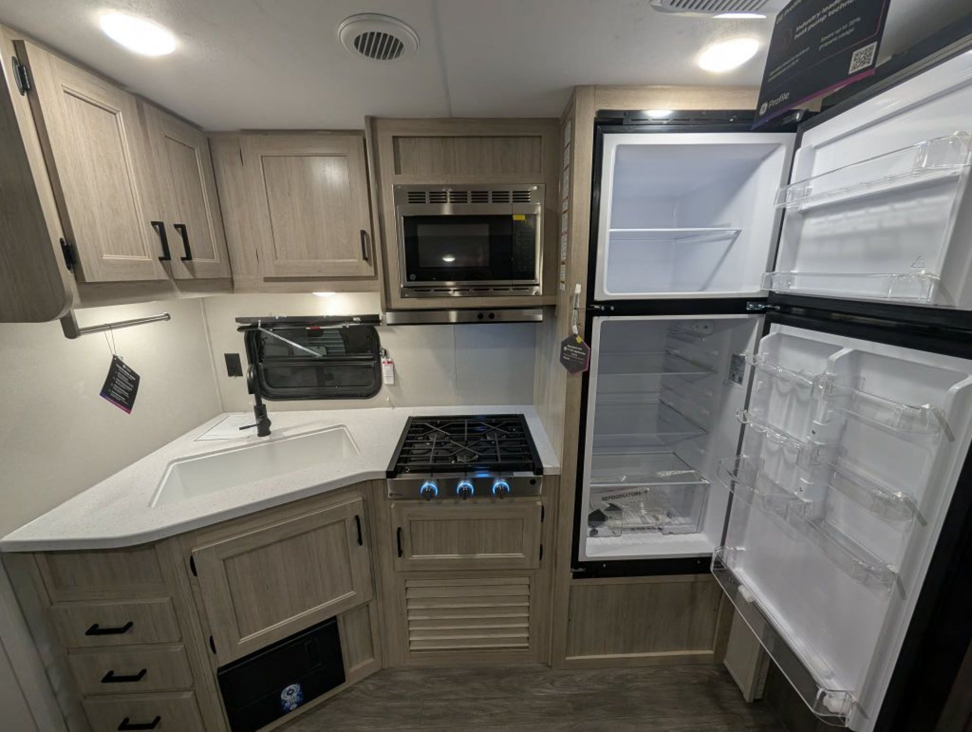 - Kitchen & Bath: Features a 10.7 cu. ft. 12V refrigerator, 3-burner gas range with oven, and a 60,000 BTU GE tankless water heater.