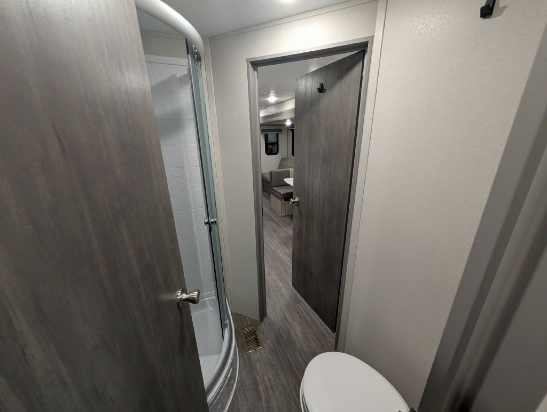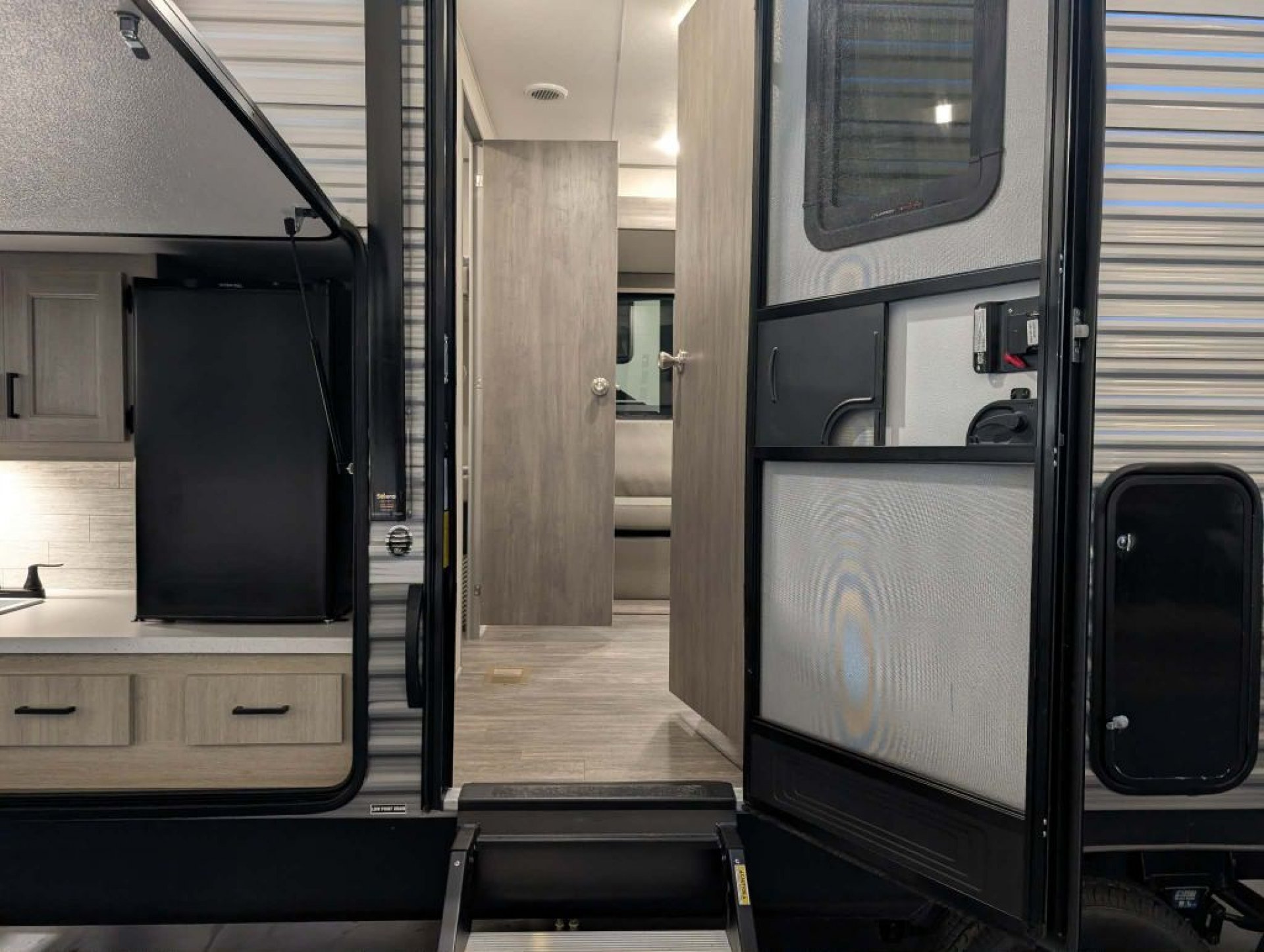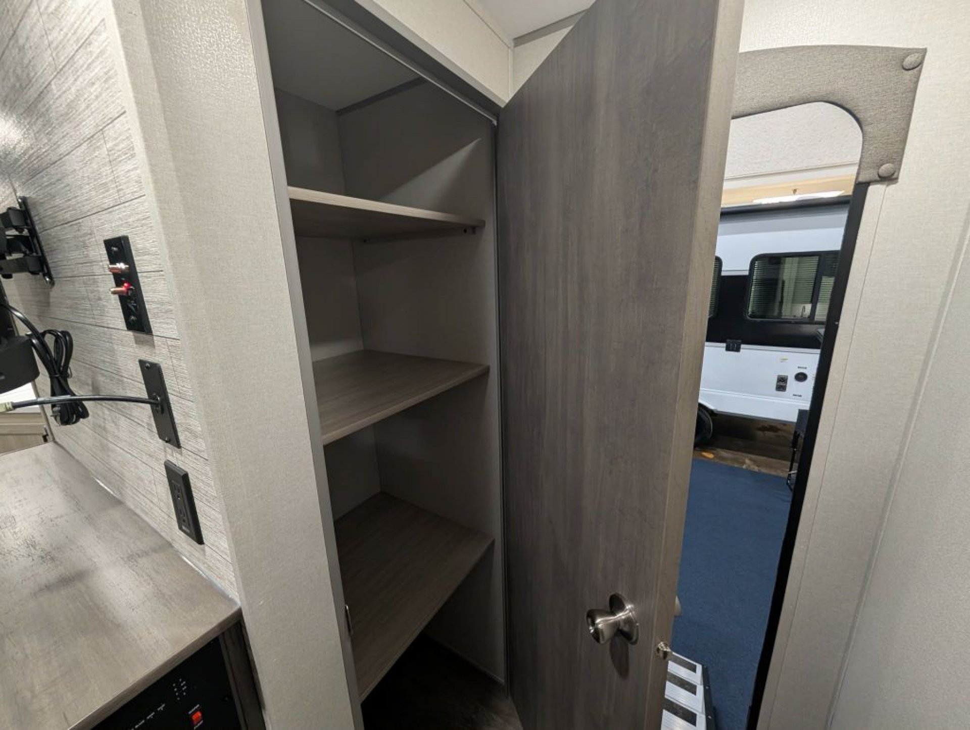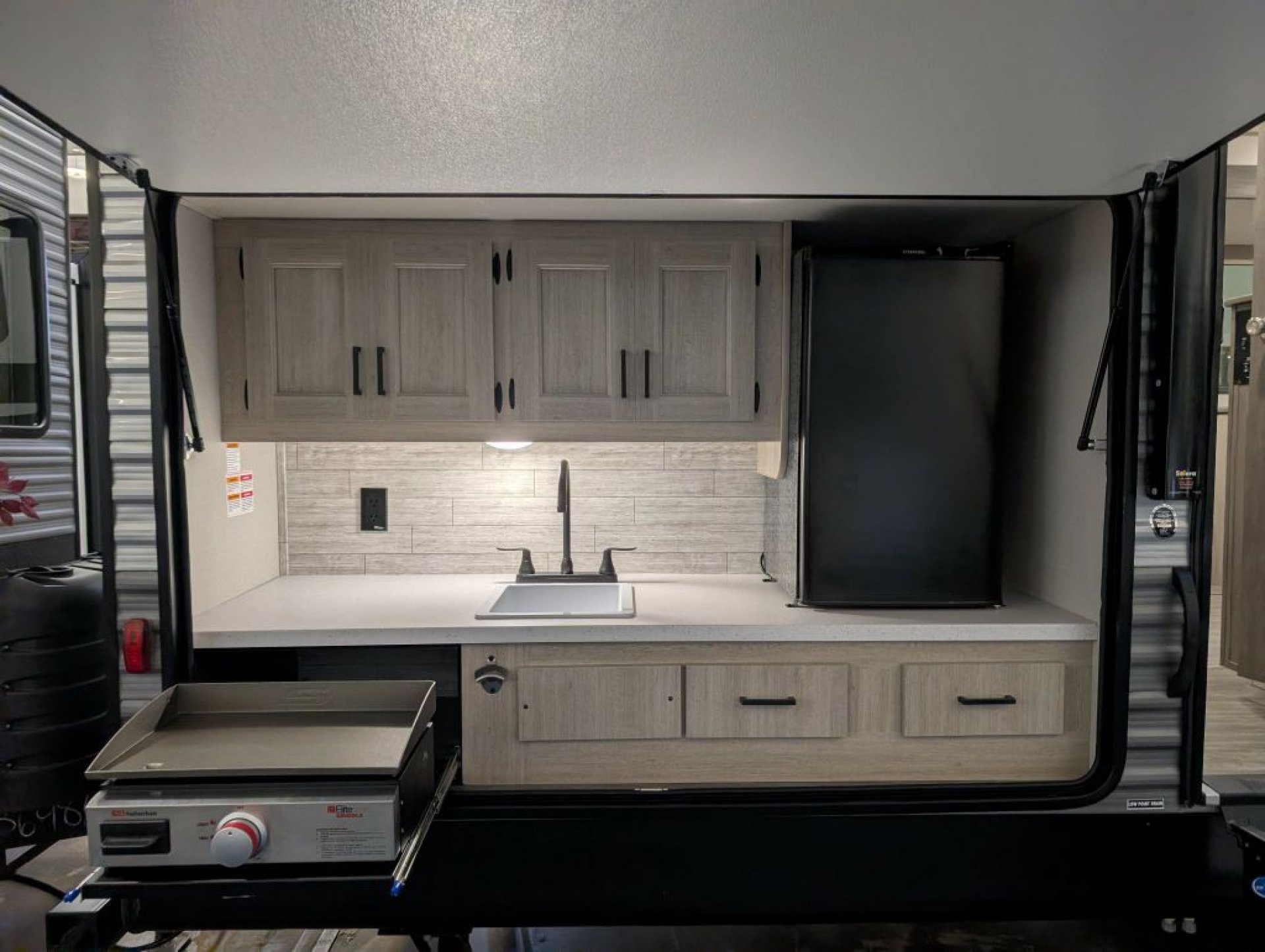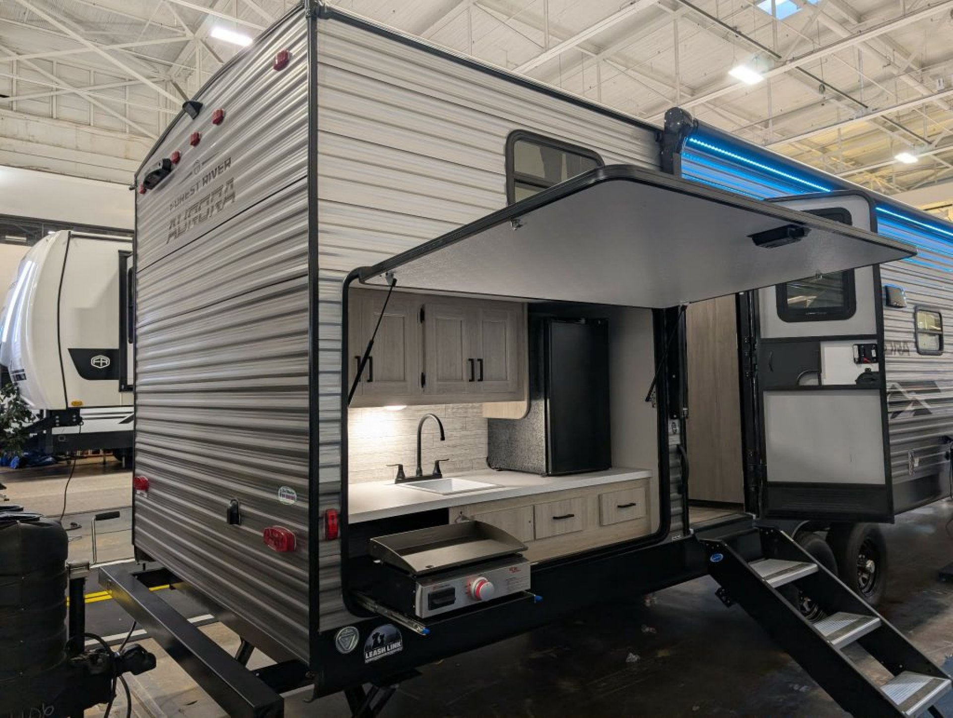 - Outdoor Living: 21' electric awning with multicolor LED lights and remote, plus rear ladder prep and magnetic baggage door latches.