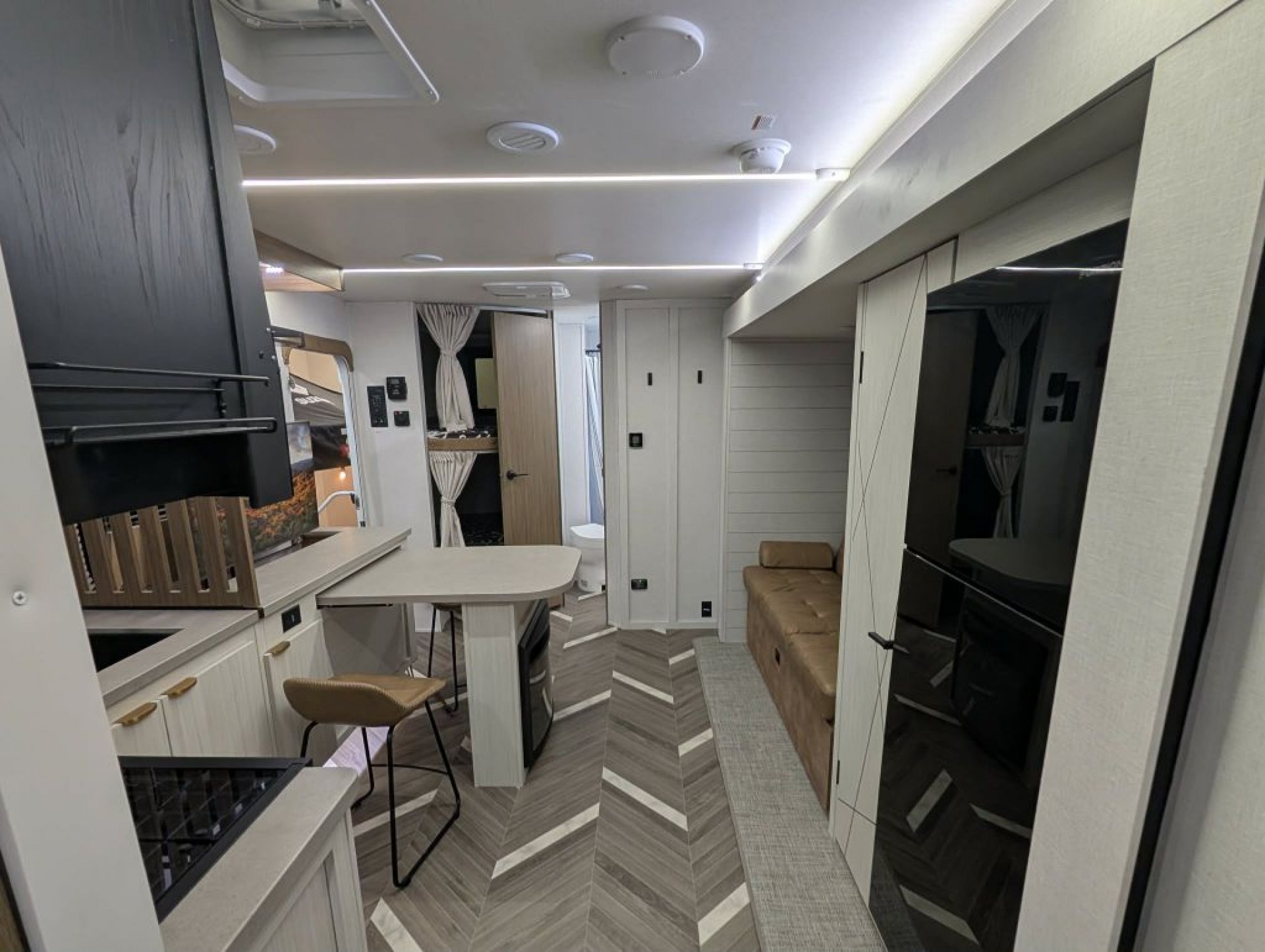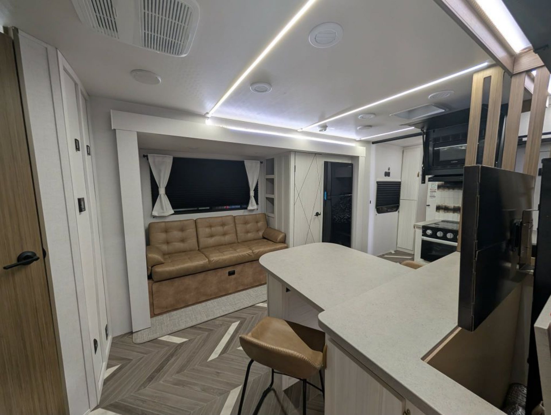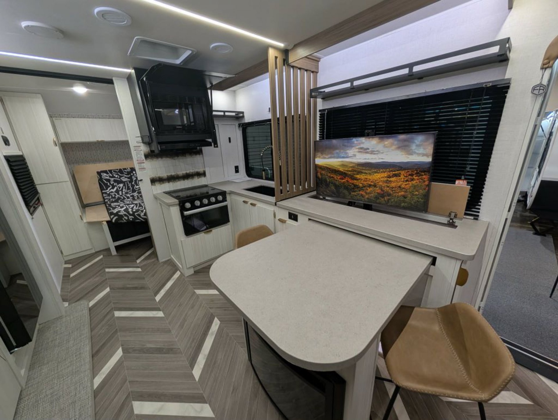 Inside, enjoy a bright and inviting living area with dimmable LED "Blade Lighting," a JBL interior/exterior sound system, and a Versa Tilt Bed Incliner for added comfort. The double bunks offer plenty of room for kids or guests, while the deep basin kitchen sink, seamless countertops, and upgraded appliance package make mealtime simple and efficient.